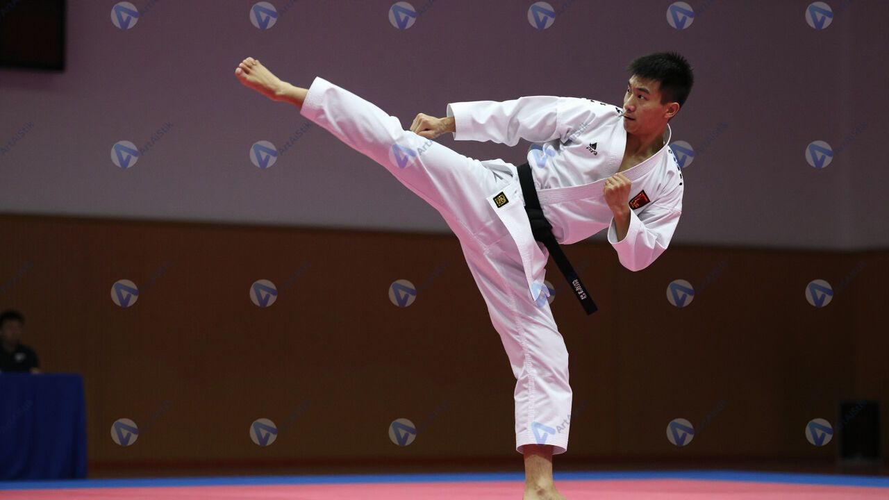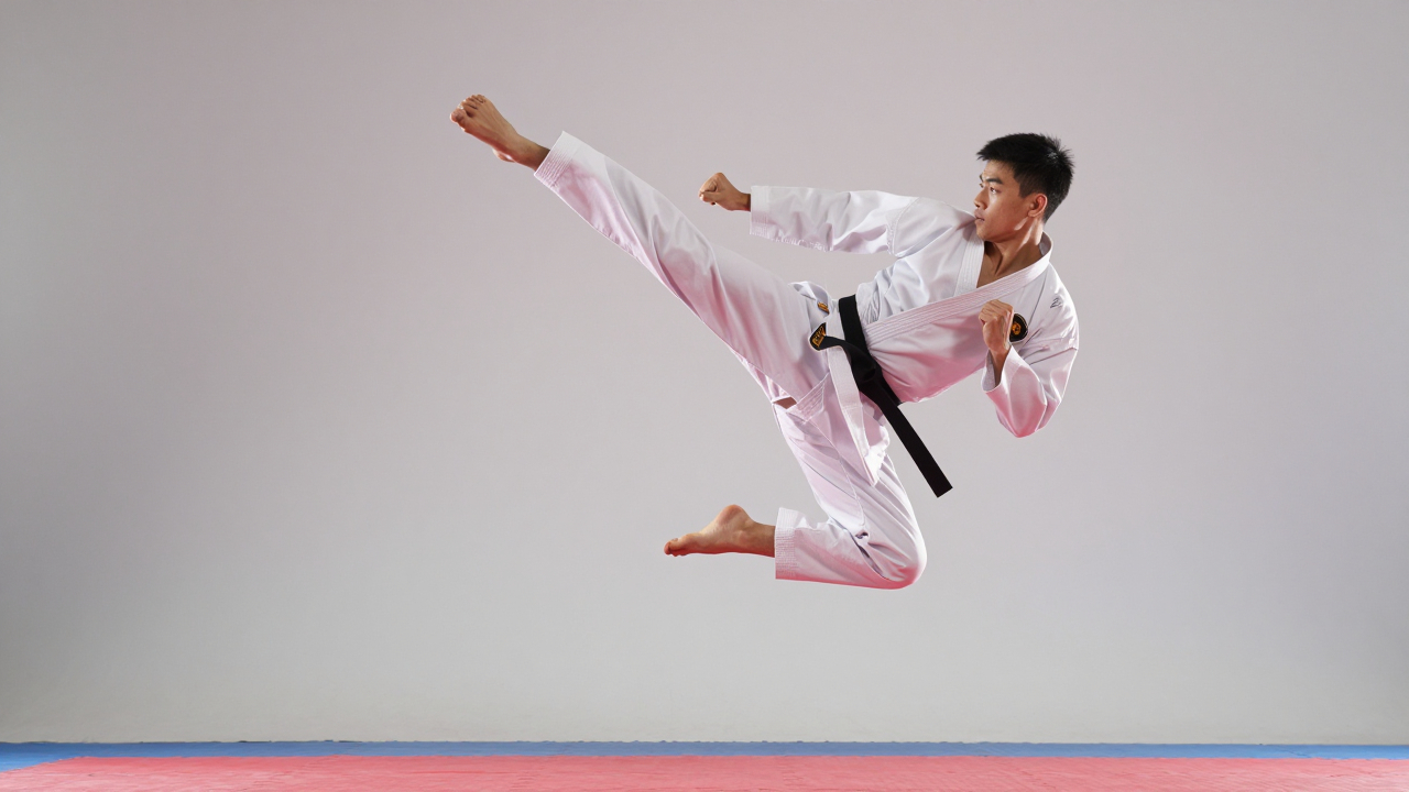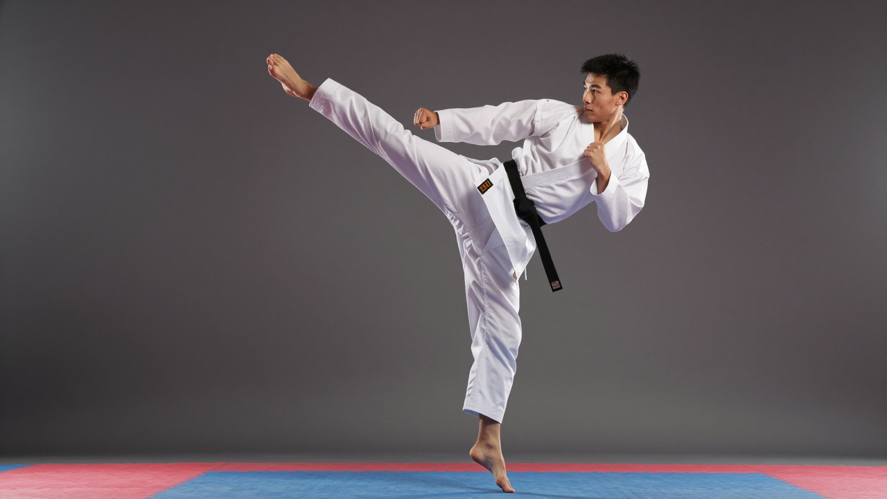 Боец карате наносит удар ногой в воздухе, каратэ‑ги развевается.