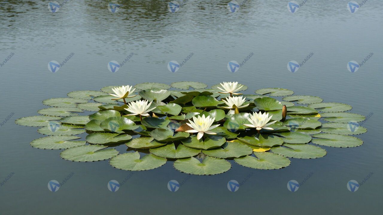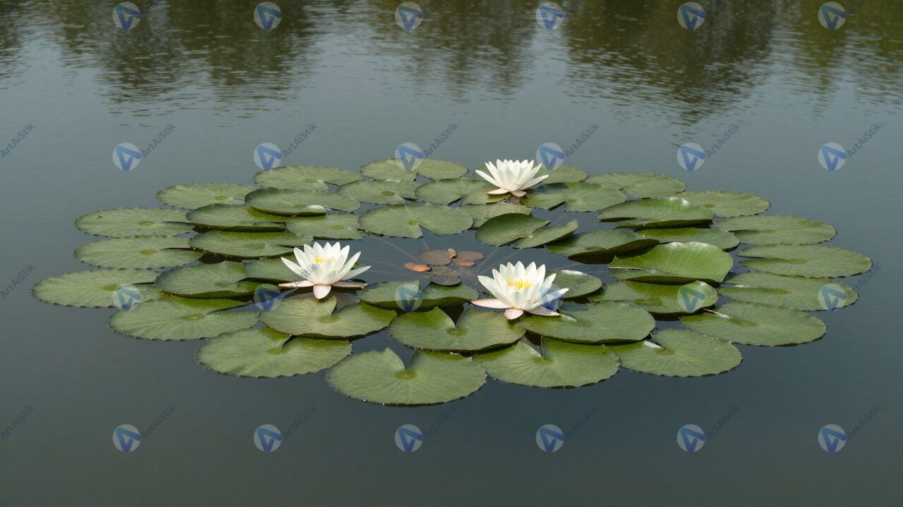 Озеро с кувшинками, зелёные листья, цветы, тихая вода.