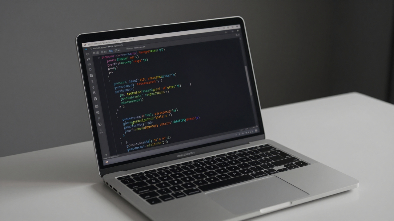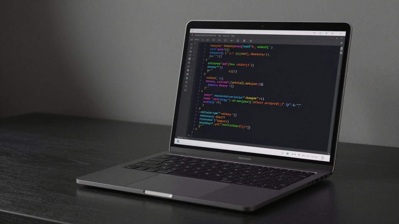 Ноутбук на рабочем столе, тёмный режим кода на экране.