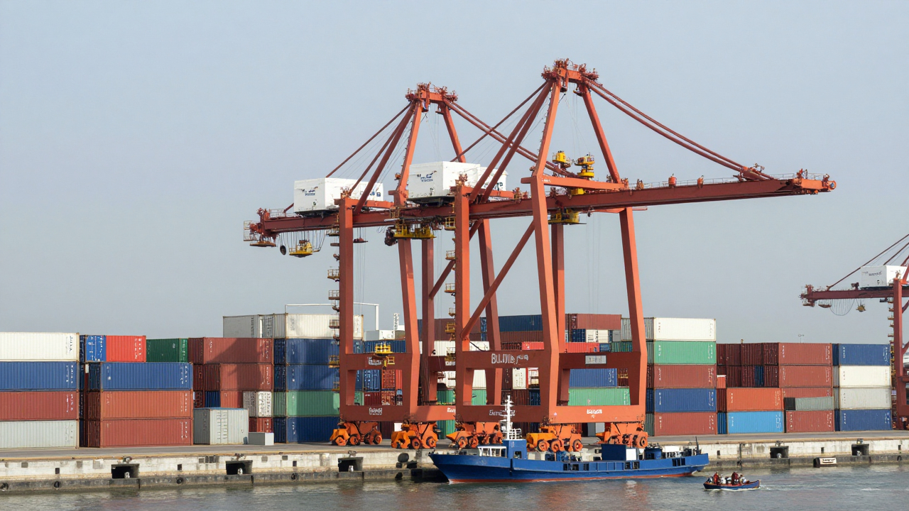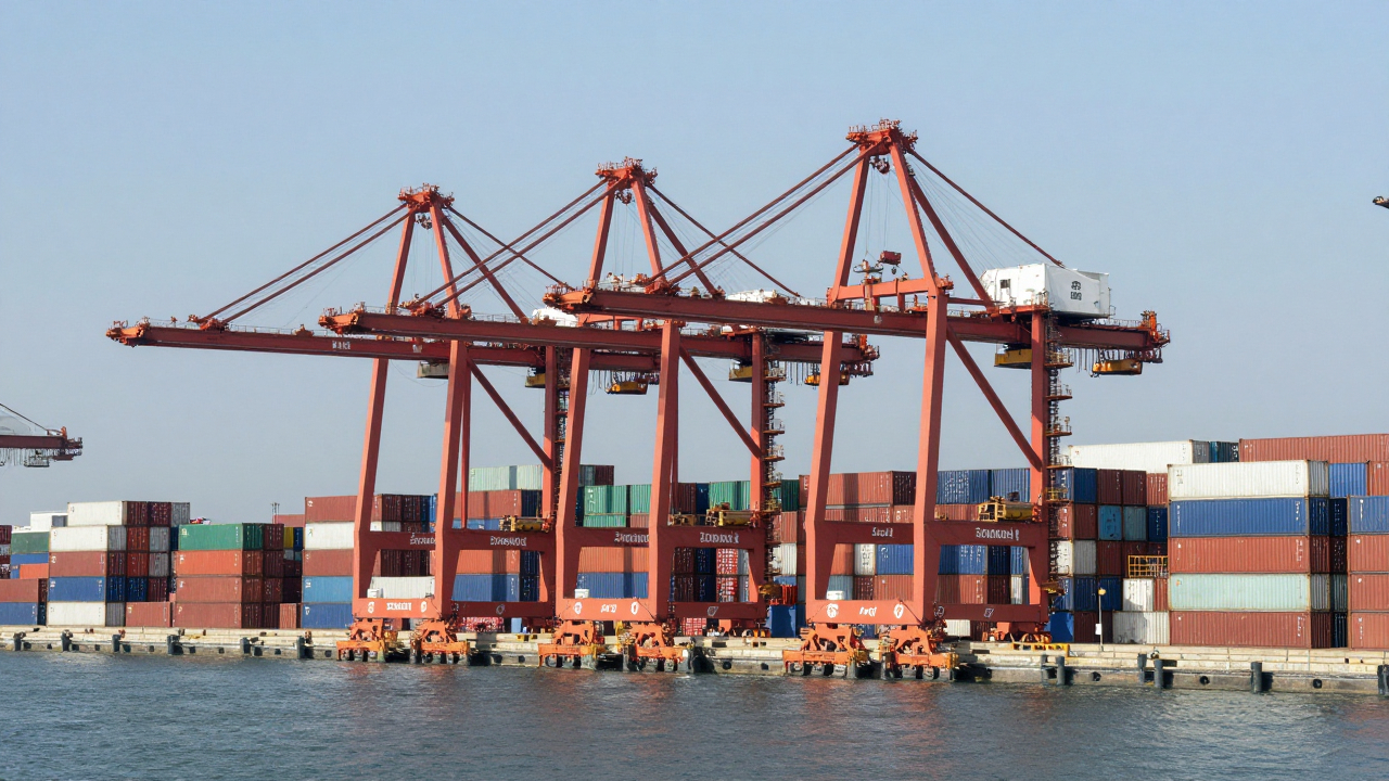 Большой контейнерный порт, краны и штабеля контейнеров.