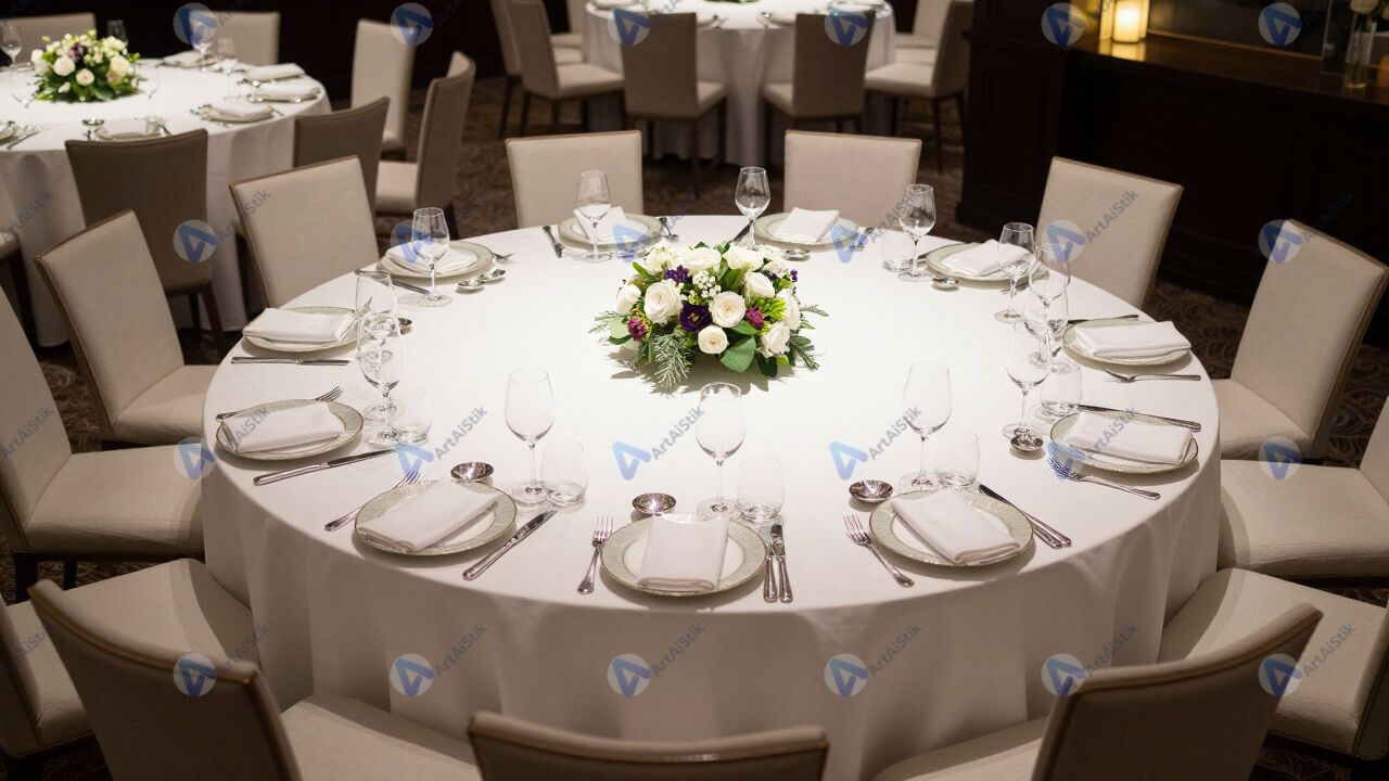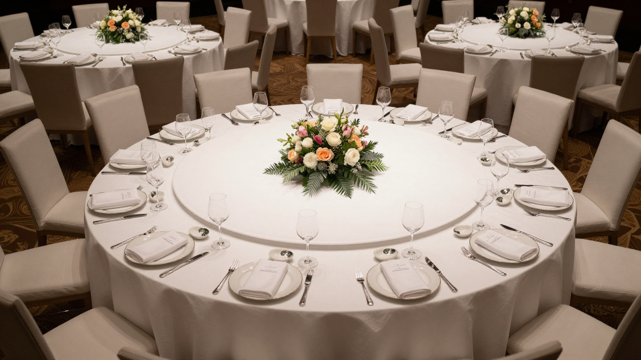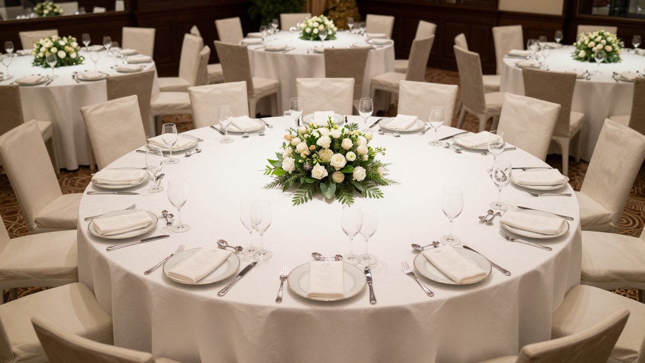 Большой круглый стол, полностью накрытый к свадебному торжеству.