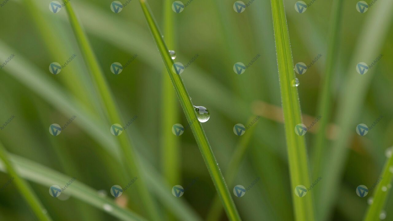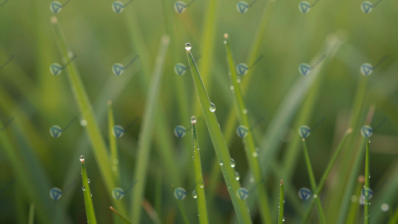 Макро‑снимок травы, отдельные стебли и капли росы.