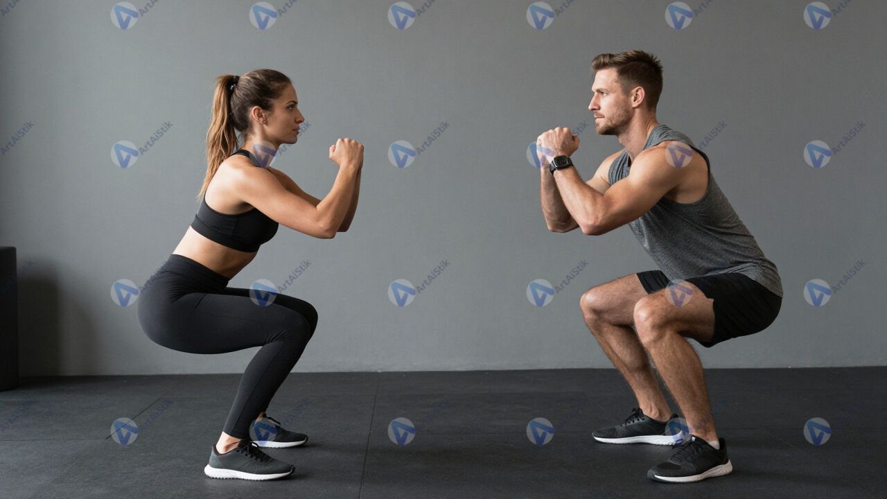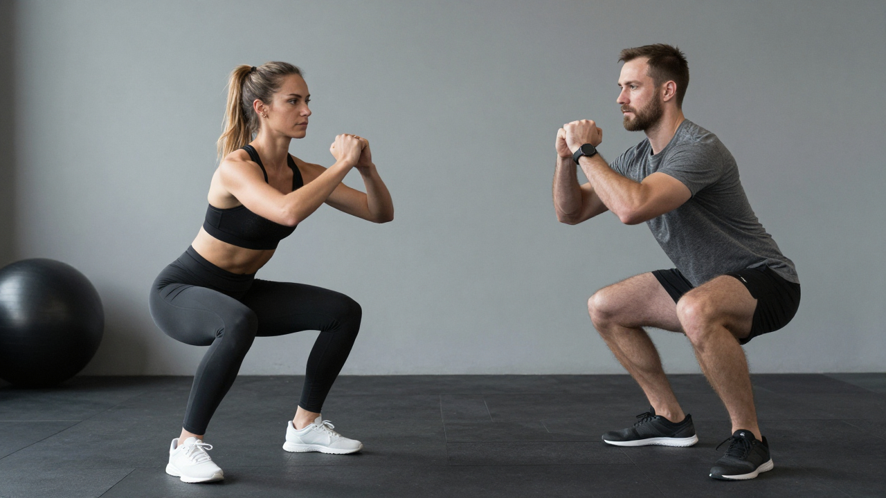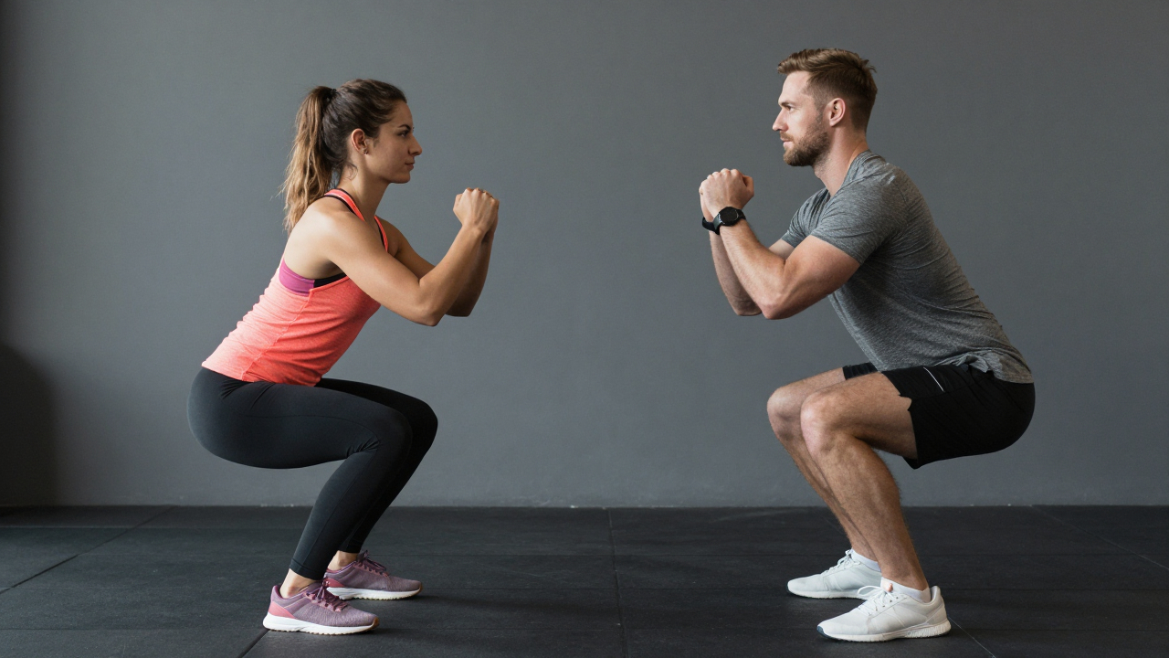 Мужчина и женщина тренируются вместе, делают синхронные приседания.