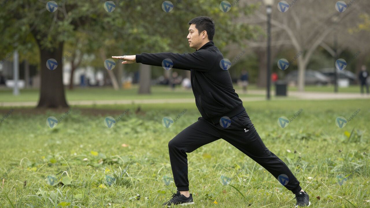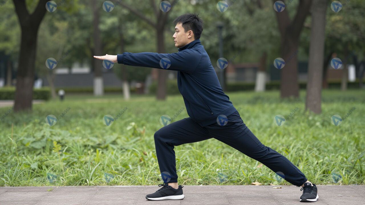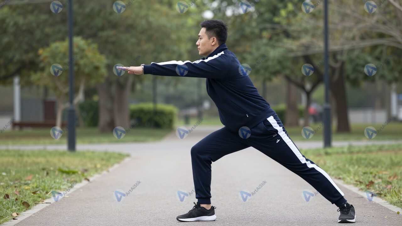 Мужчина в спортивном костюме делает растяжку в парке.