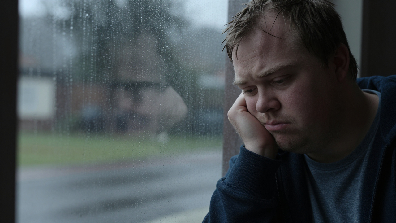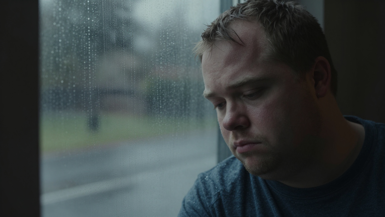 Мужчина с опущенным взглядом, дождь за окном, грусть.