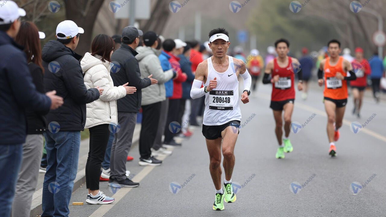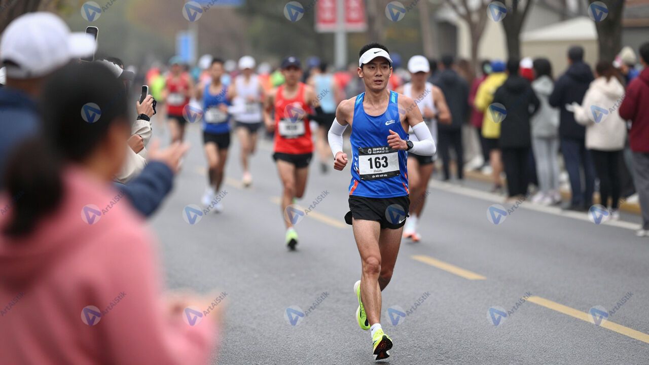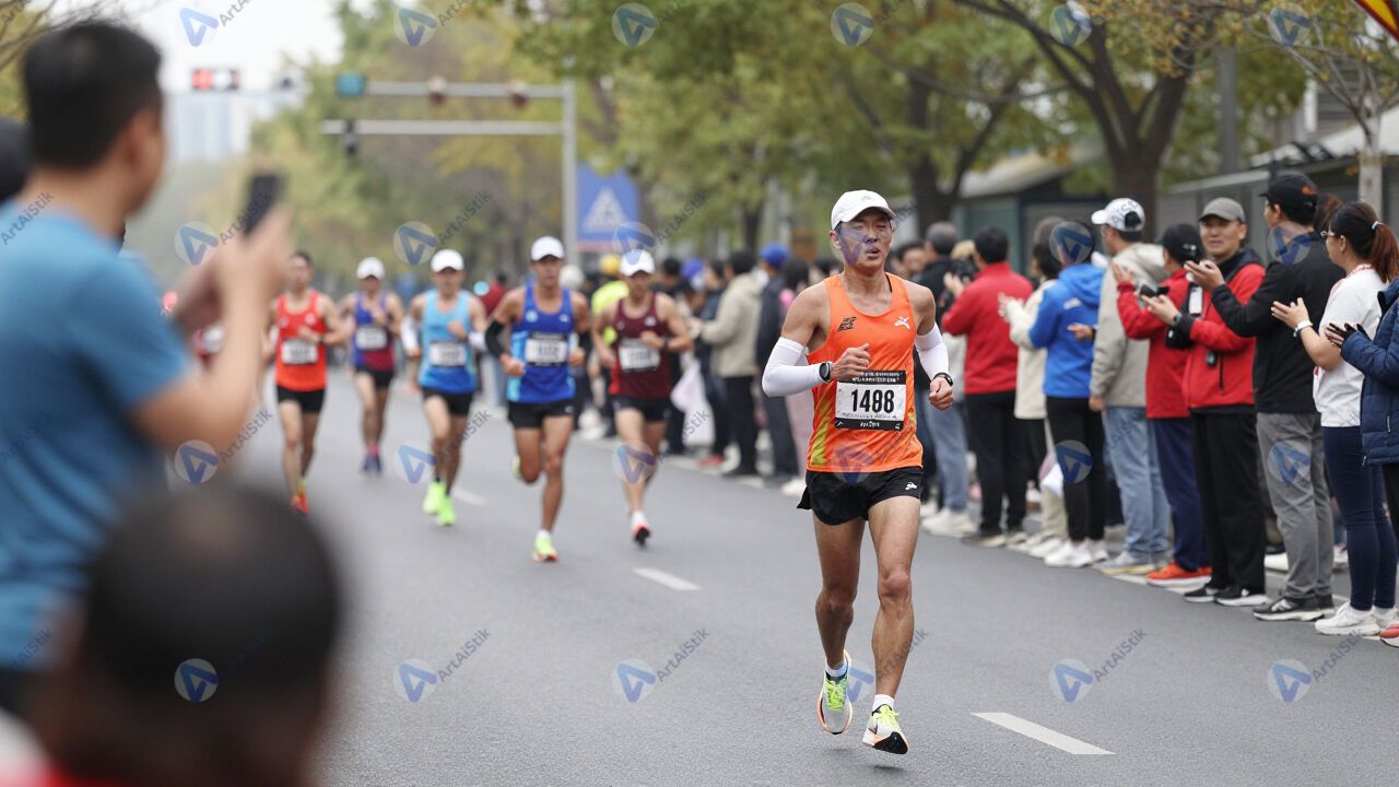 Бегун на марафоне пробегает мимо зрителей вдоль улицы.