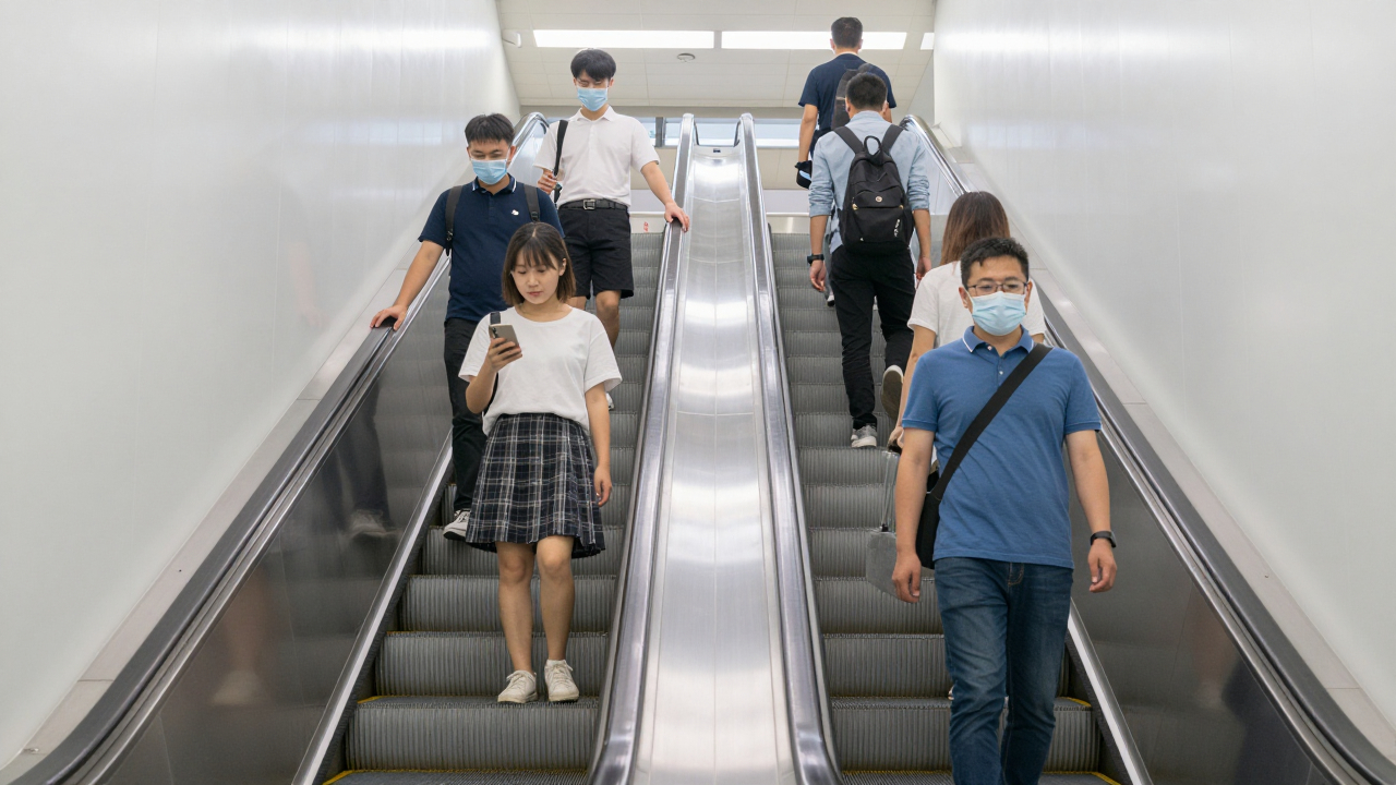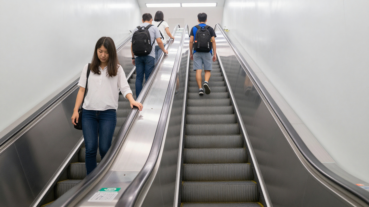 Метрополитеновский эскалатор, люди поднимаются и спускаются.
