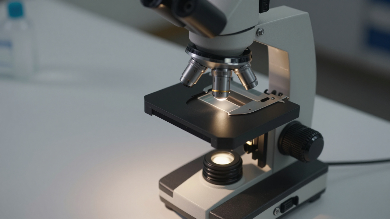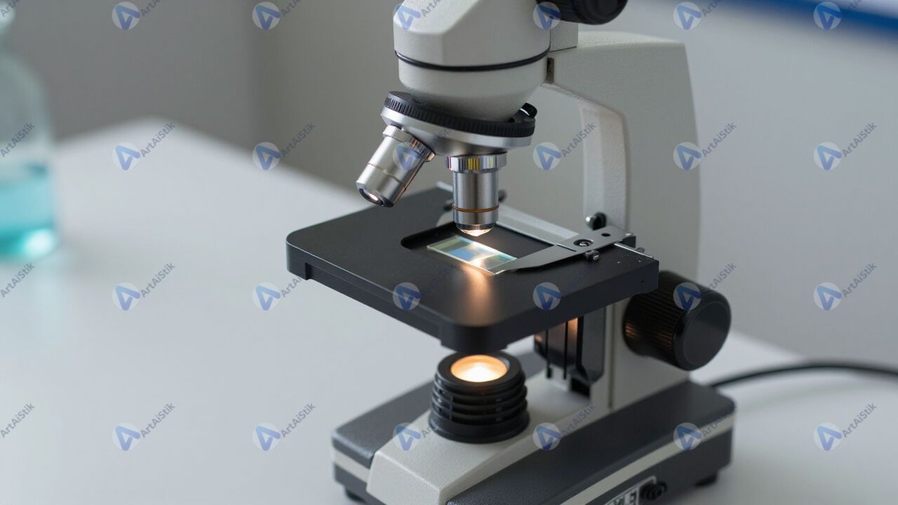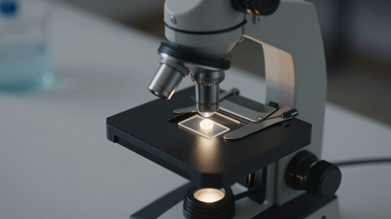 Микроскоп на столе, предметное стекло подсвечено снизу.
