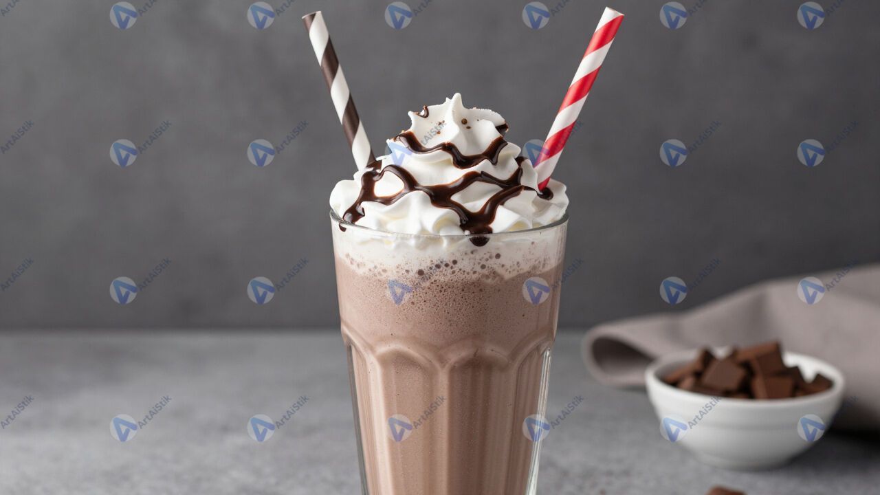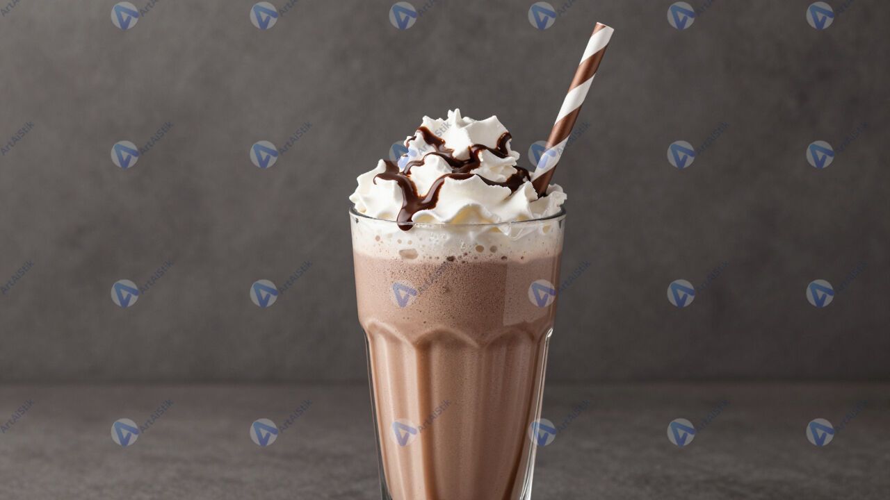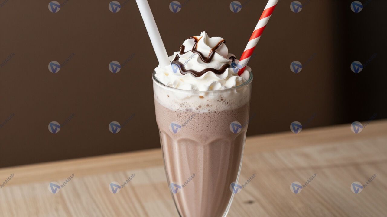 Молочный коктейль с шоколадным сиропом и трубочкой.