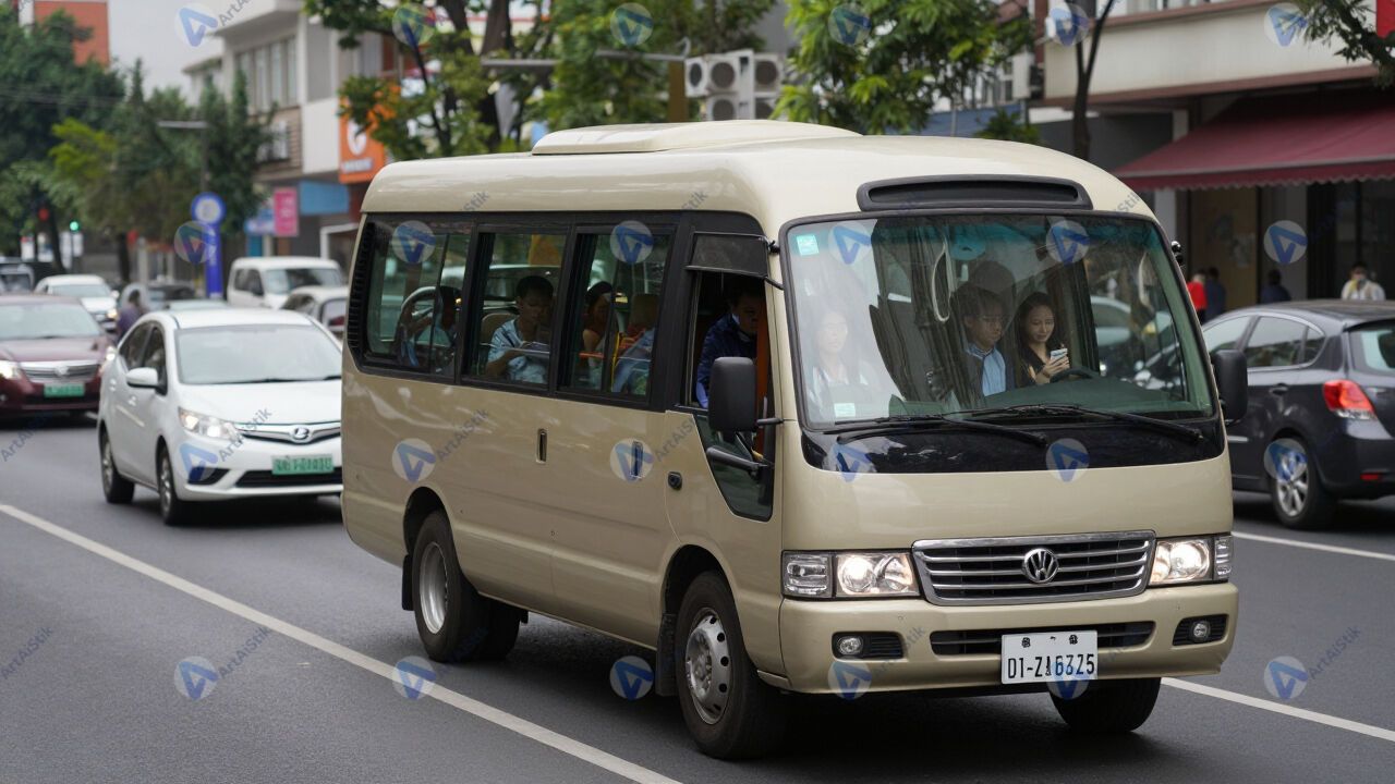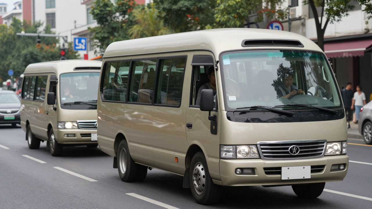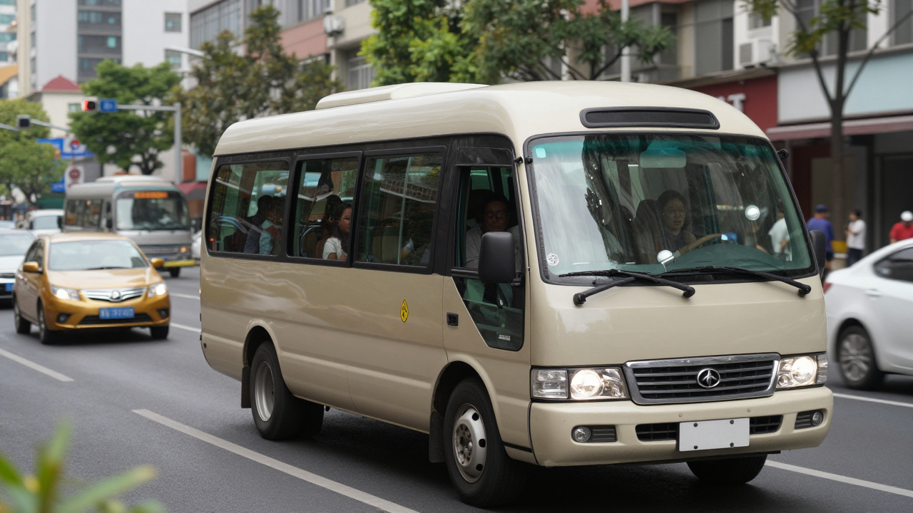 Маршрутка/микроавтобус с пассажирами в городском потоке.