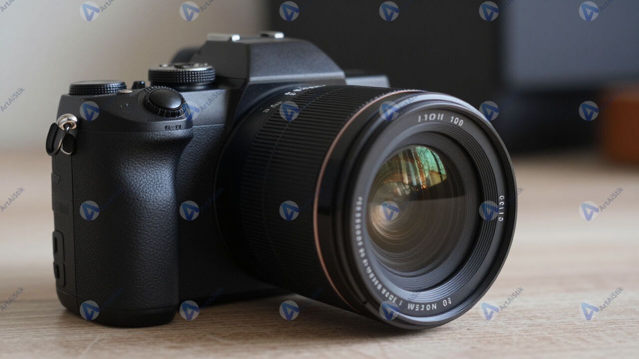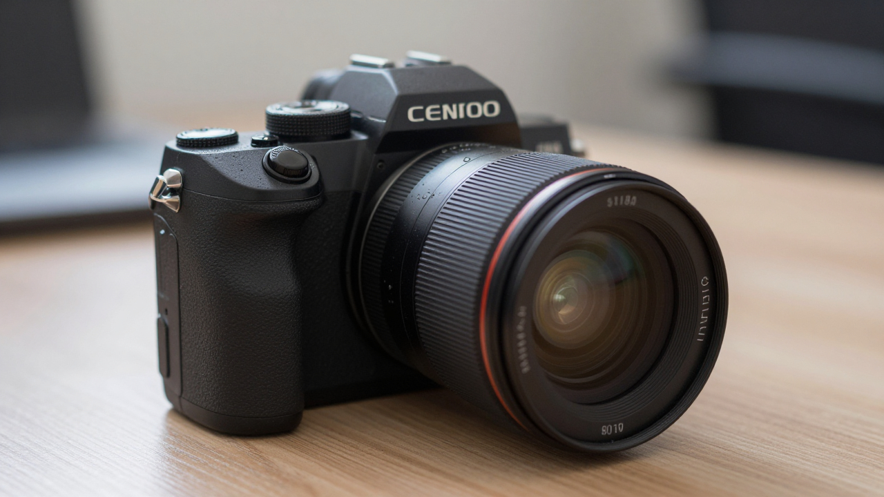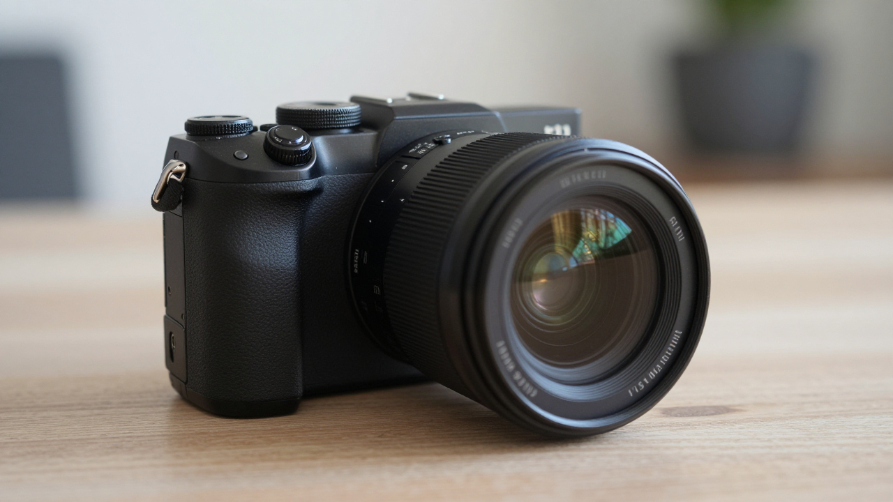 Беззеркальная камера на столе, объектив рядом без крышки.