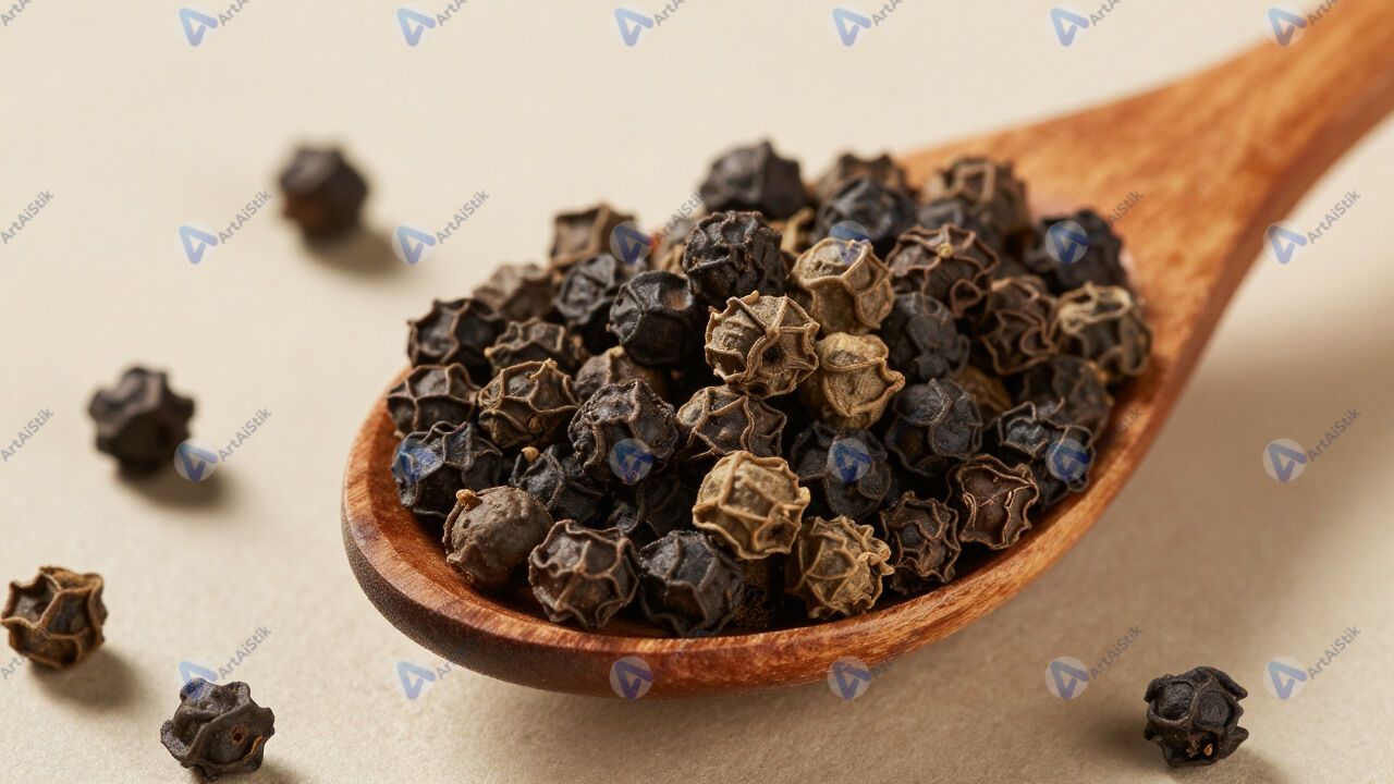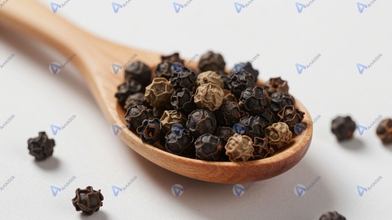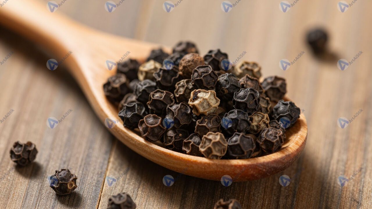 Смесь перца горошком в деревянной ложке.