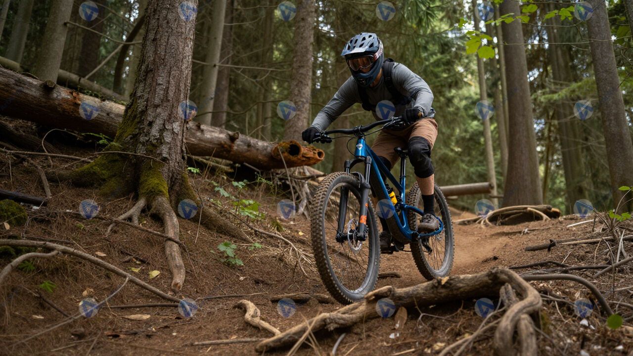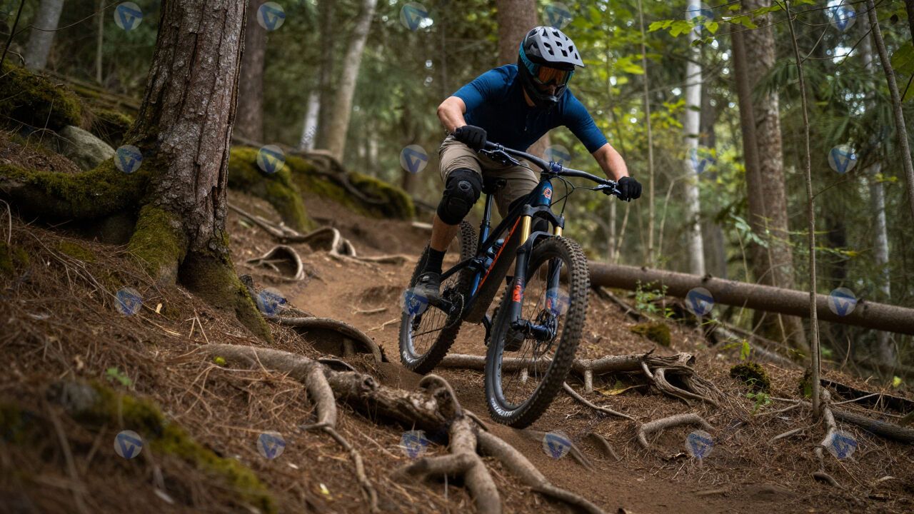 Маунтинбайкер спускается по лесной тропе с корнями.
