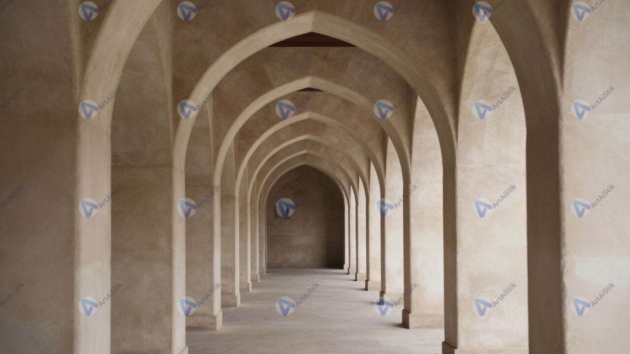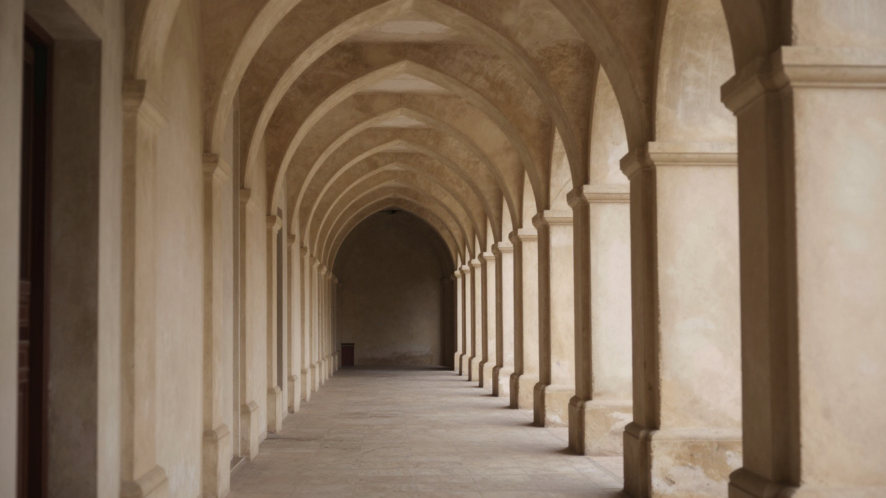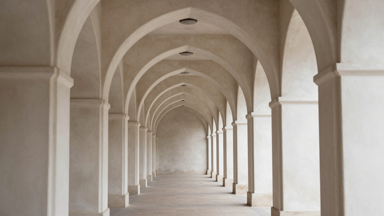 Узкая геометрическая арка с повторяющимися сводами, уходящими в перспективу.