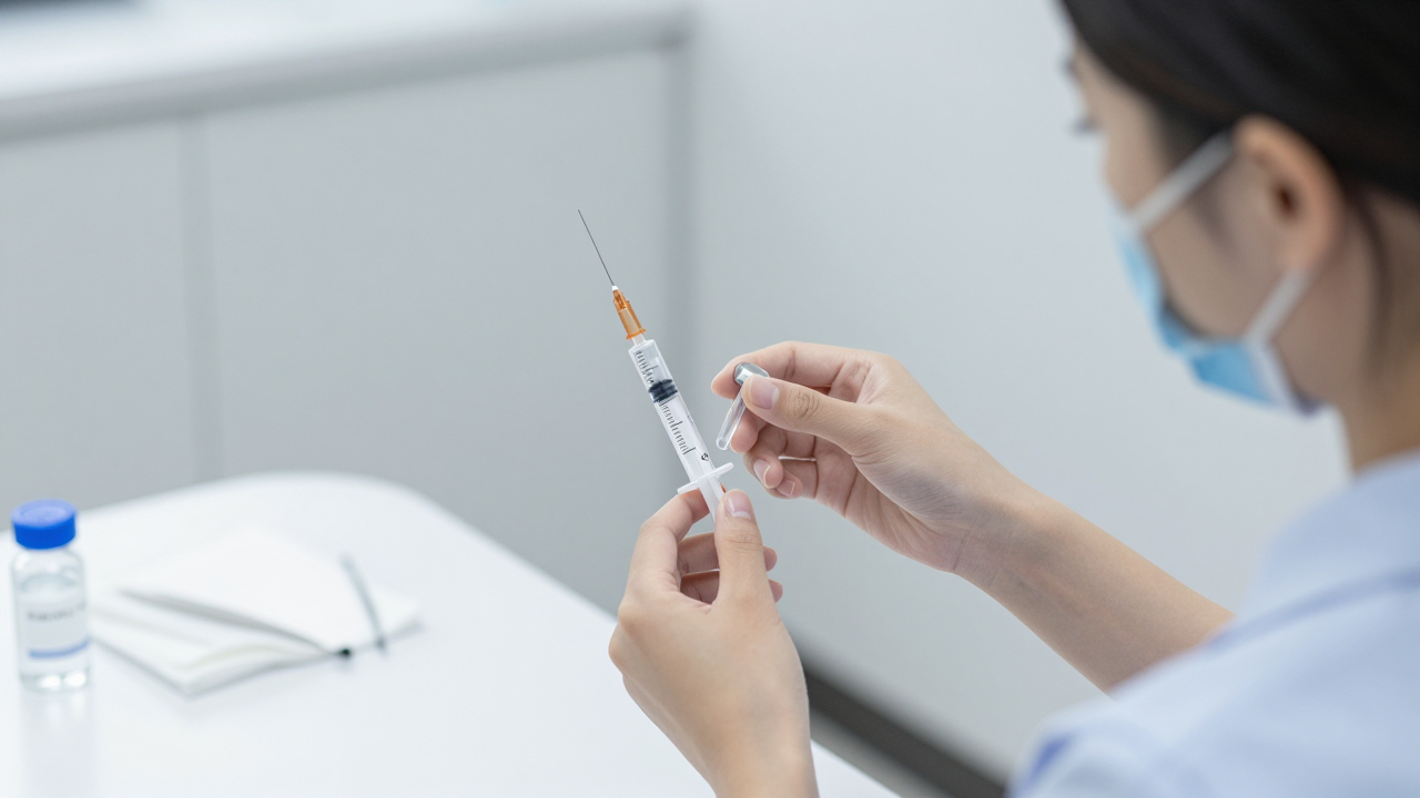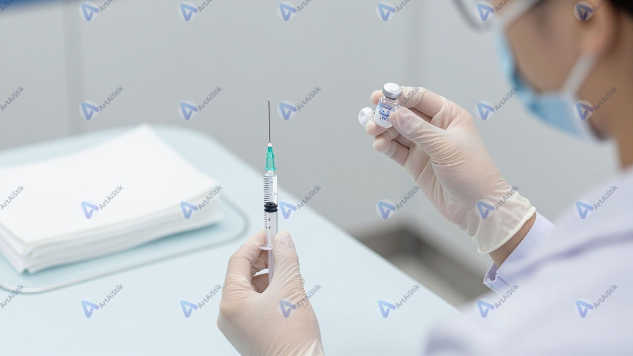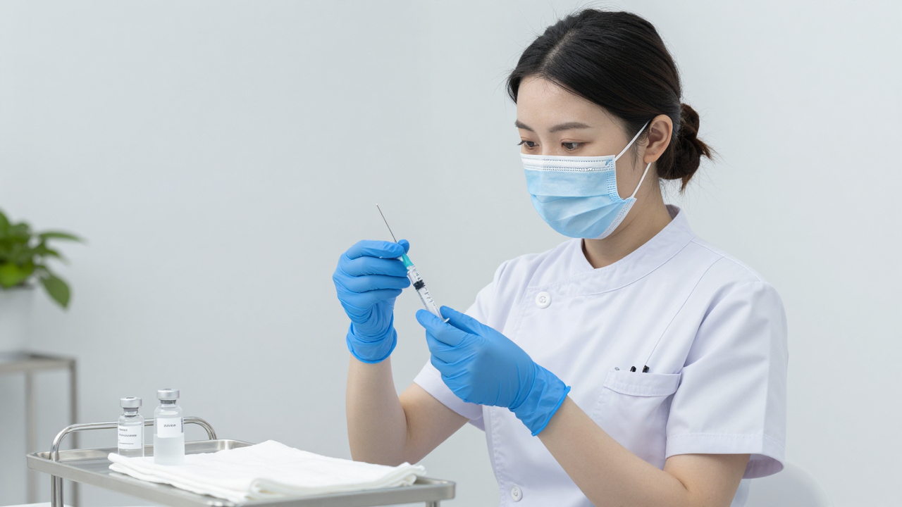 Медсестра готовит шприц с вакциной, перевязочный стол.