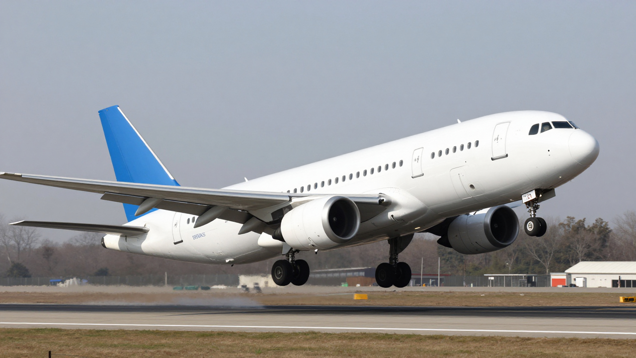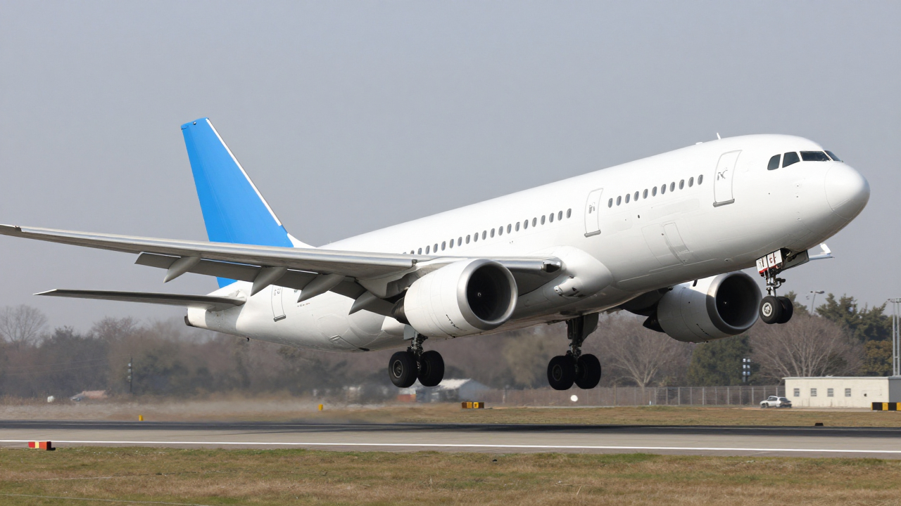 Пассажирский самолёт взлетает, колёса отрываются от полосы.