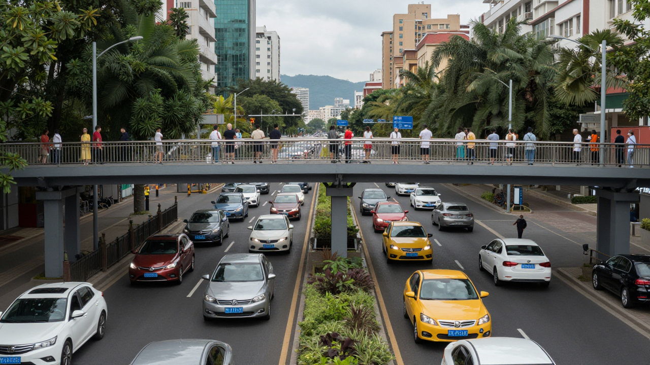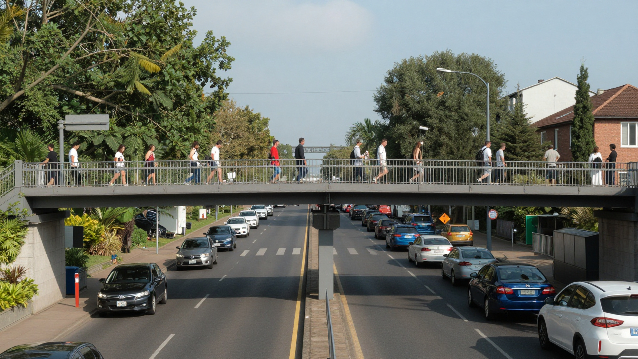 Пешеходный мост над оживлённой улицей, машины внизу.