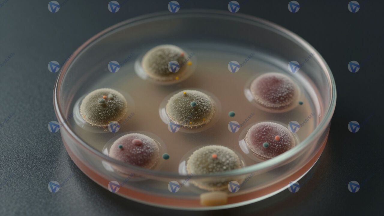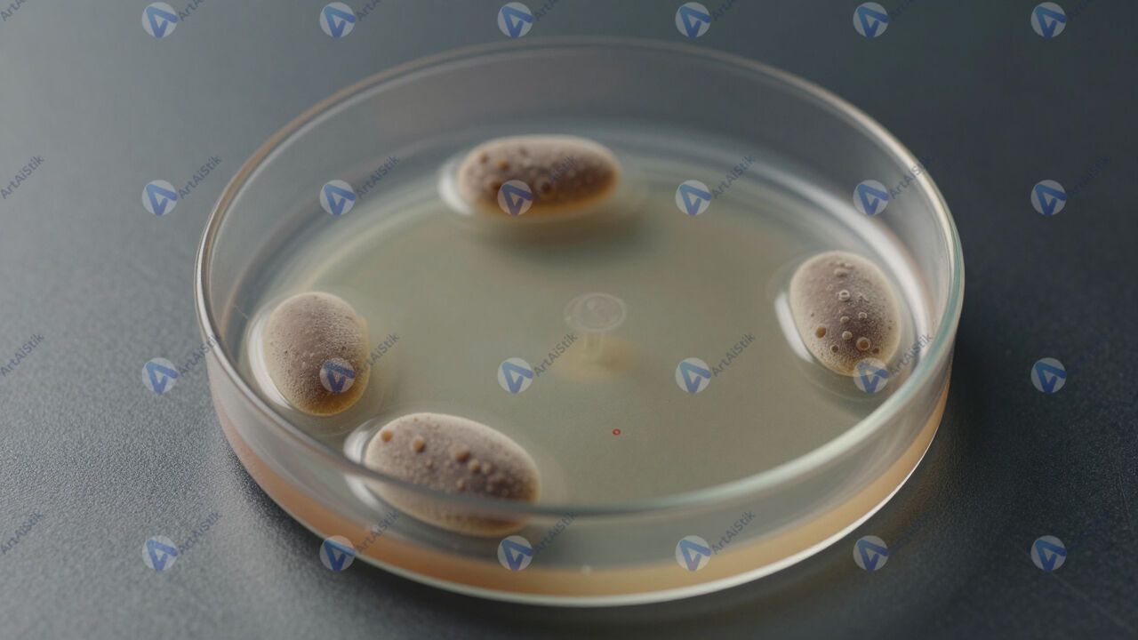 Чаша Петри с колониями бактерий под стеклянной крышкой.