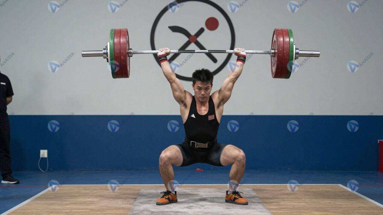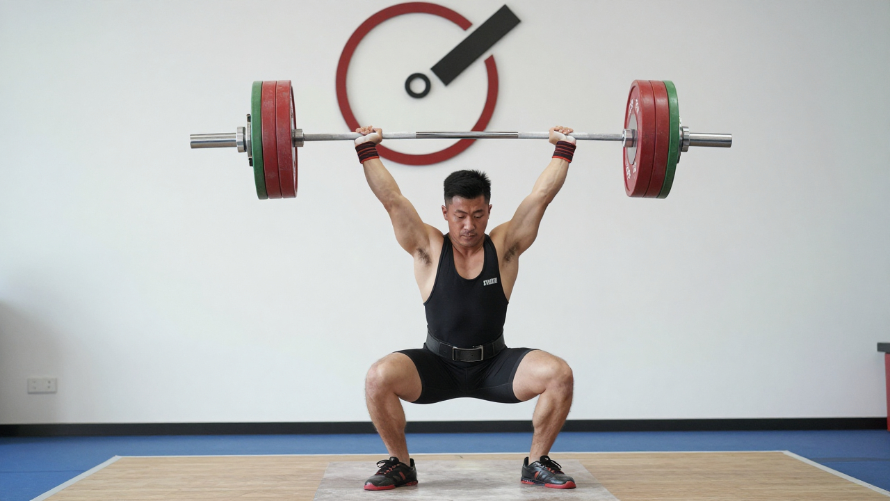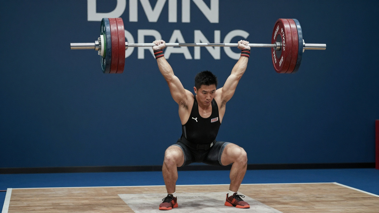 Соревнования по пауэрлифтингу, спортсмен поднимает штангу над головой.
