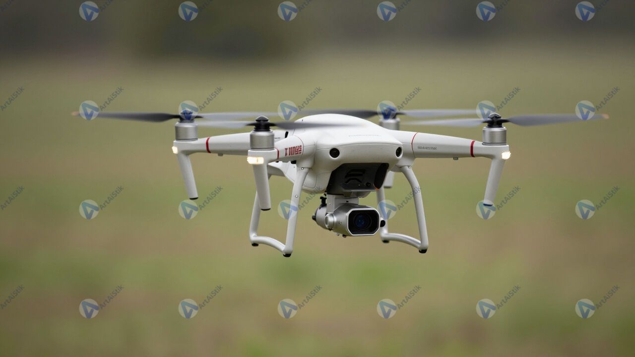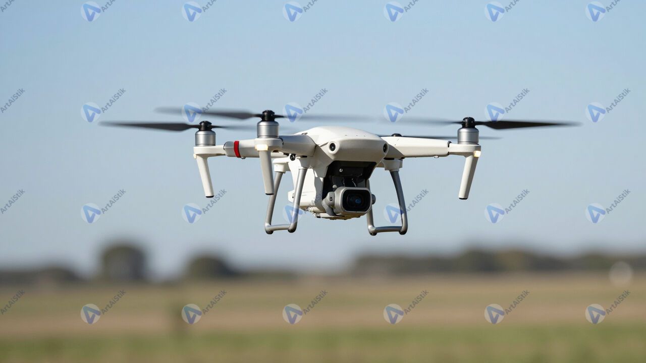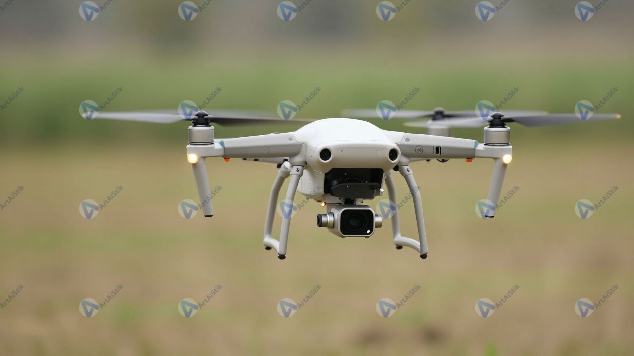 Квадрокоптер‑дрон завис в воздухе над полем.
