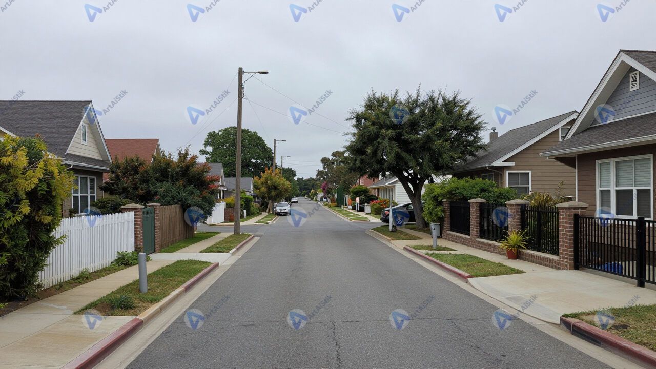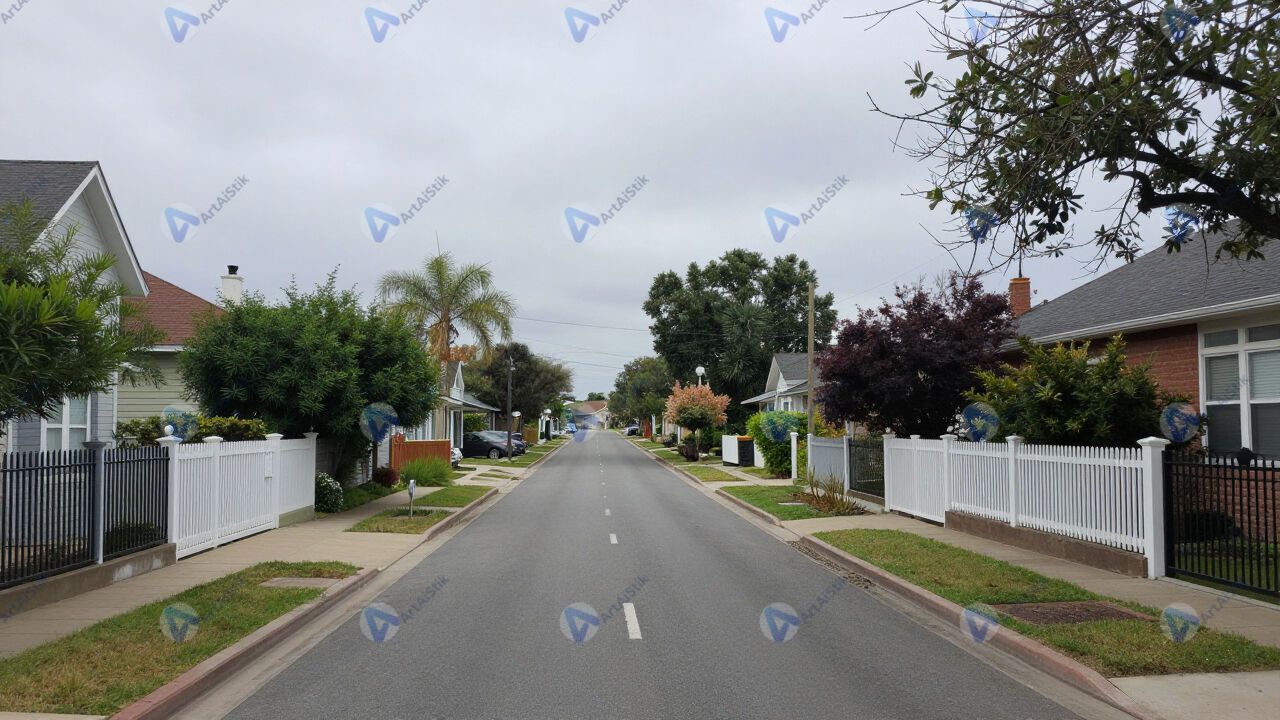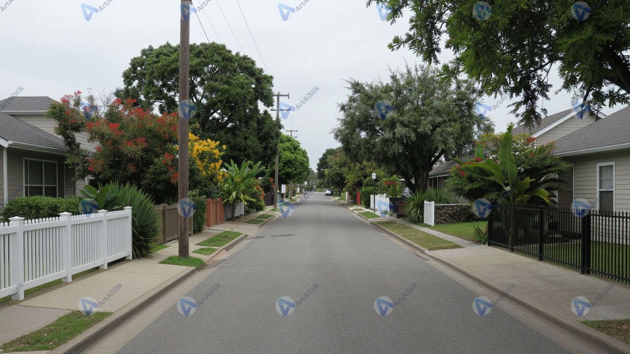 Тихая улочка частного сектора с низкими заборами и садами.