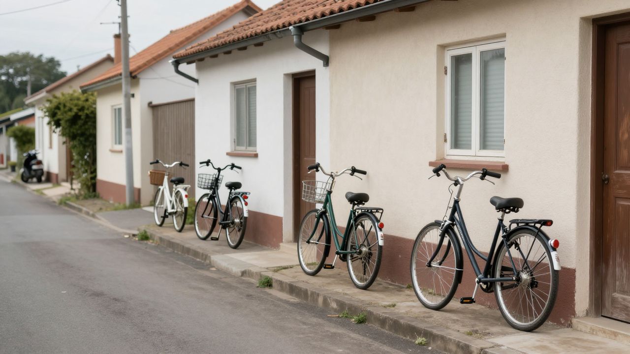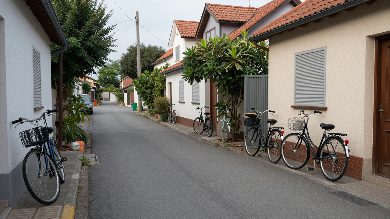 Тихая улочка с велосипедами, прислонёнными к стенам домов.