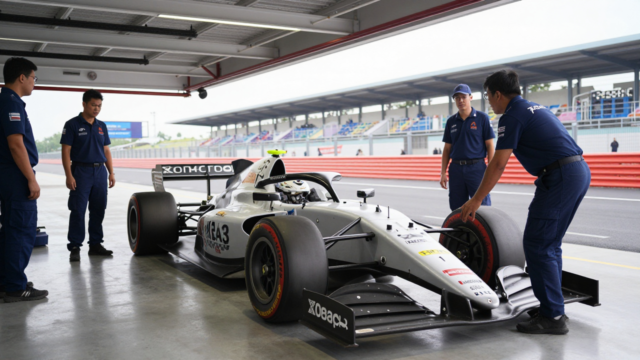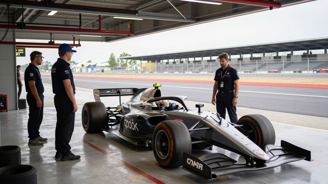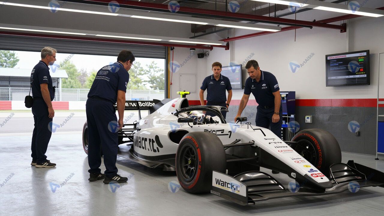 Гоночный автомобиль в боксах, механики вокруг.