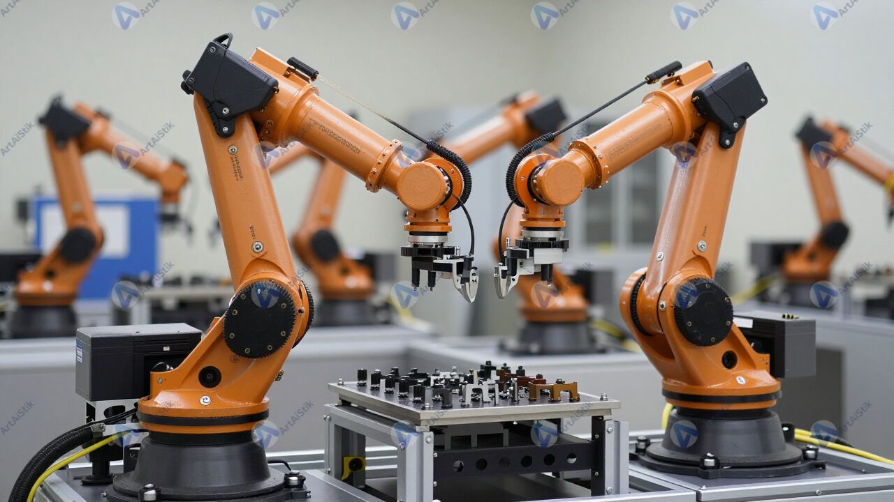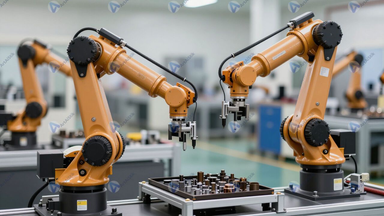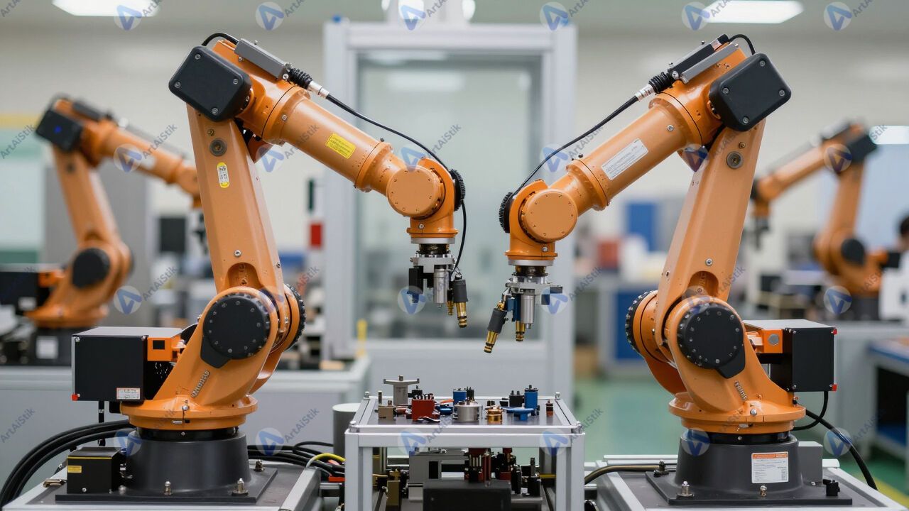 Робот‑манипулятор на заводской линии перекладывает детали.