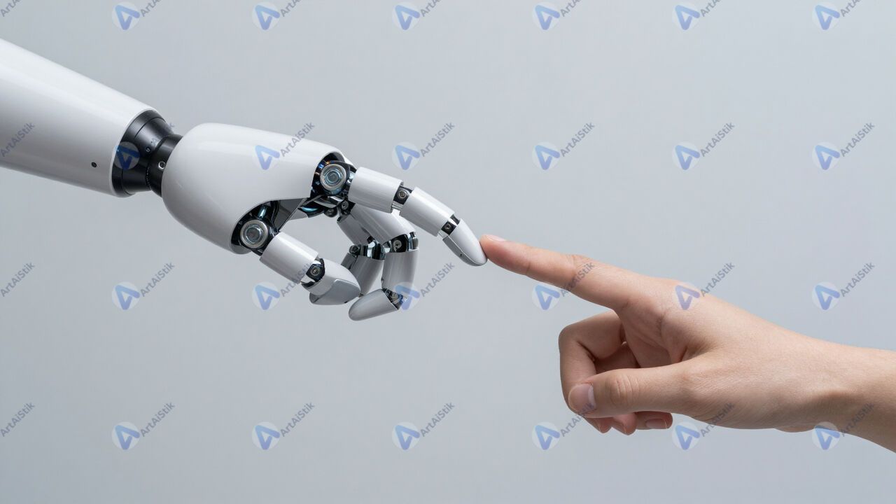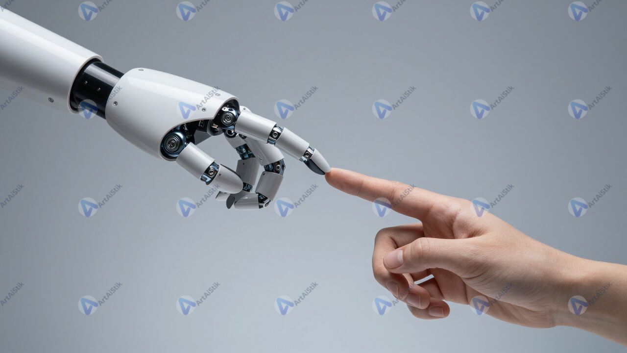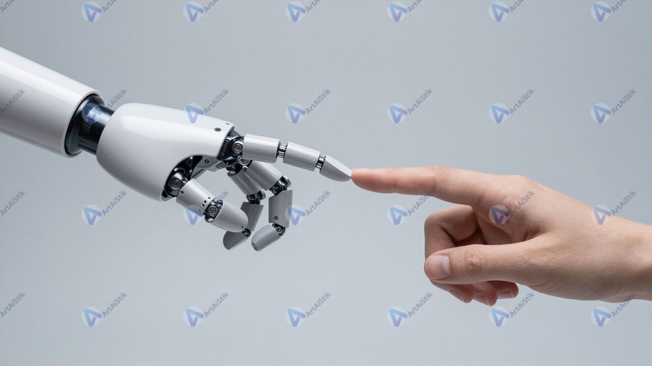 Рука робота и рука человека касаются кончиками пальцев.