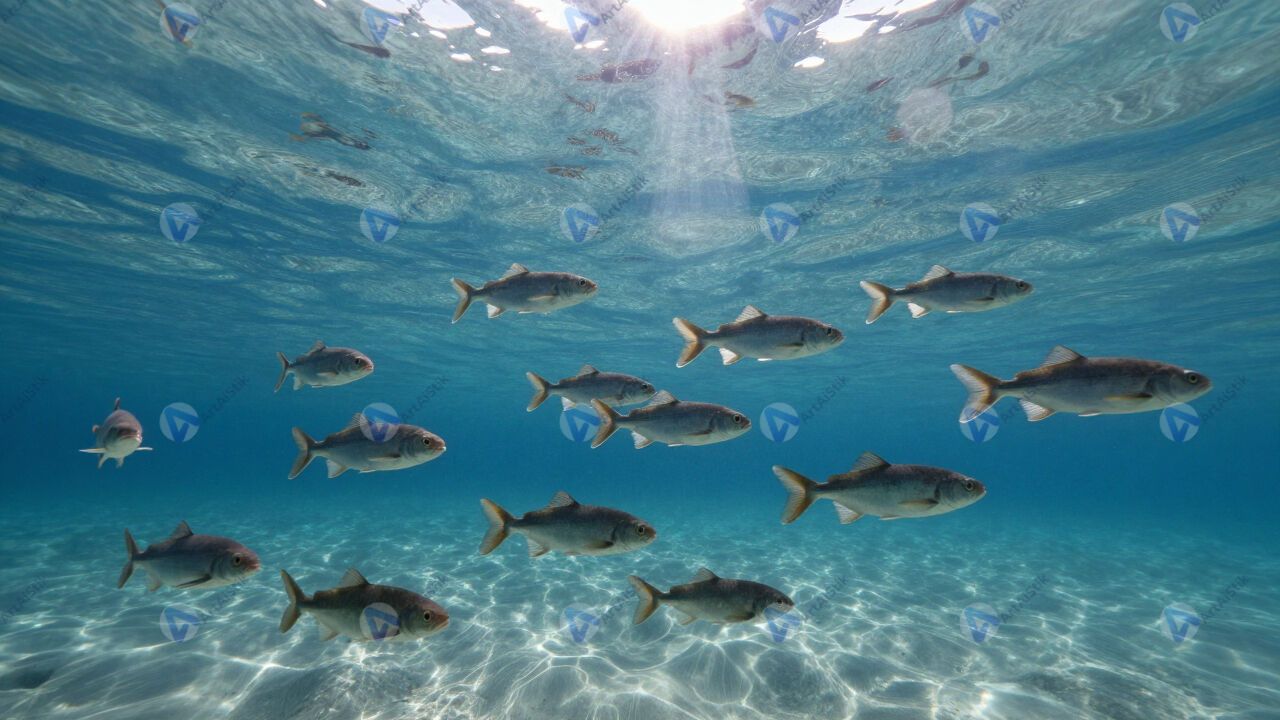 Стая рыб в прозрачной воде, солнечные блики.