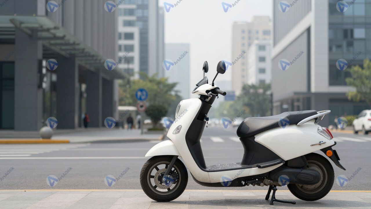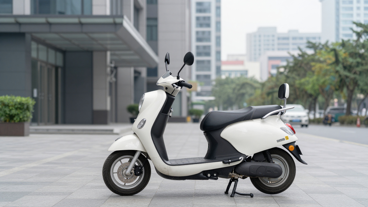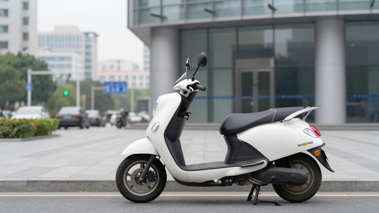 Скутер припаркован возле офисного здания, городской фон.