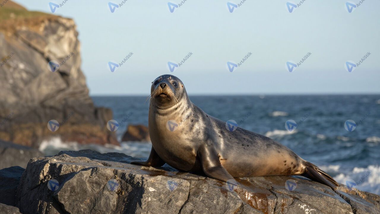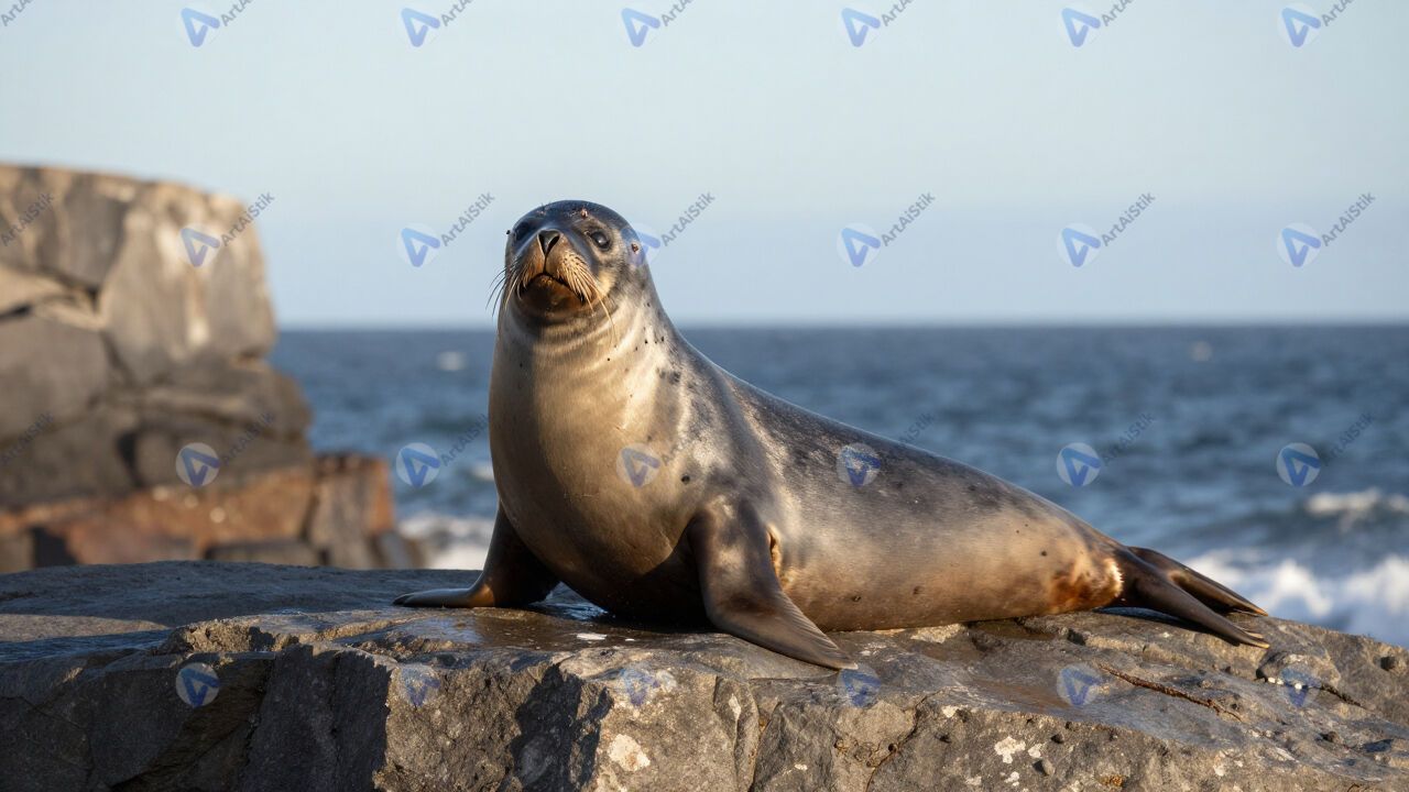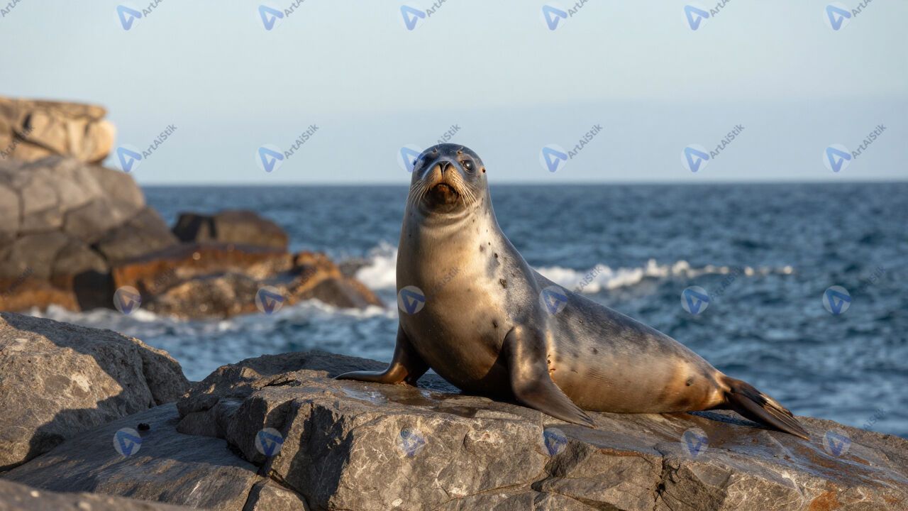 Морской котик на камне, утёс, океан, солнце.