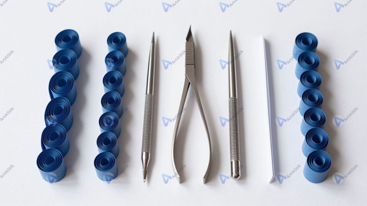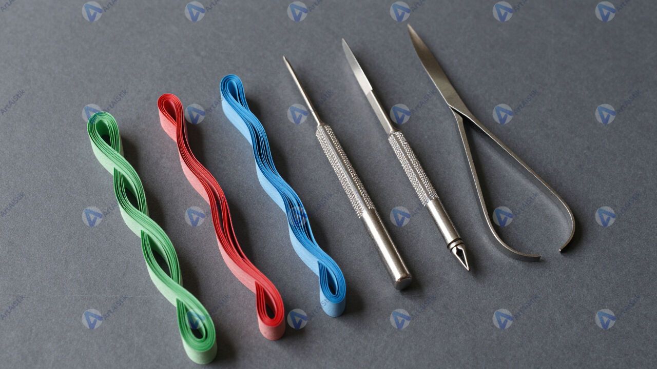 Набор инструментов для квиллинга и закрученные полоски бумаги.