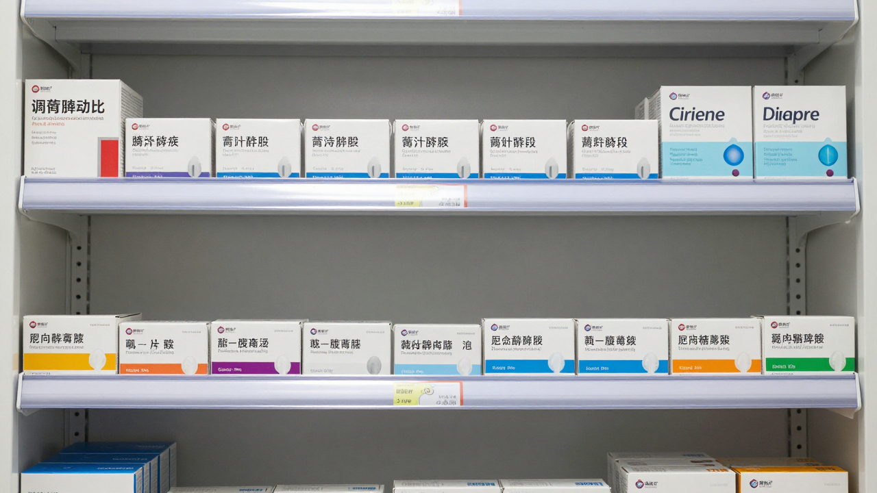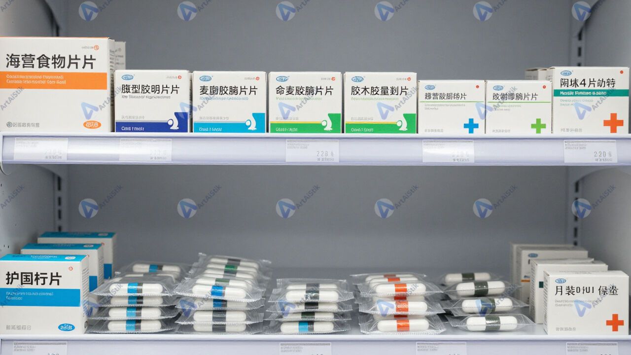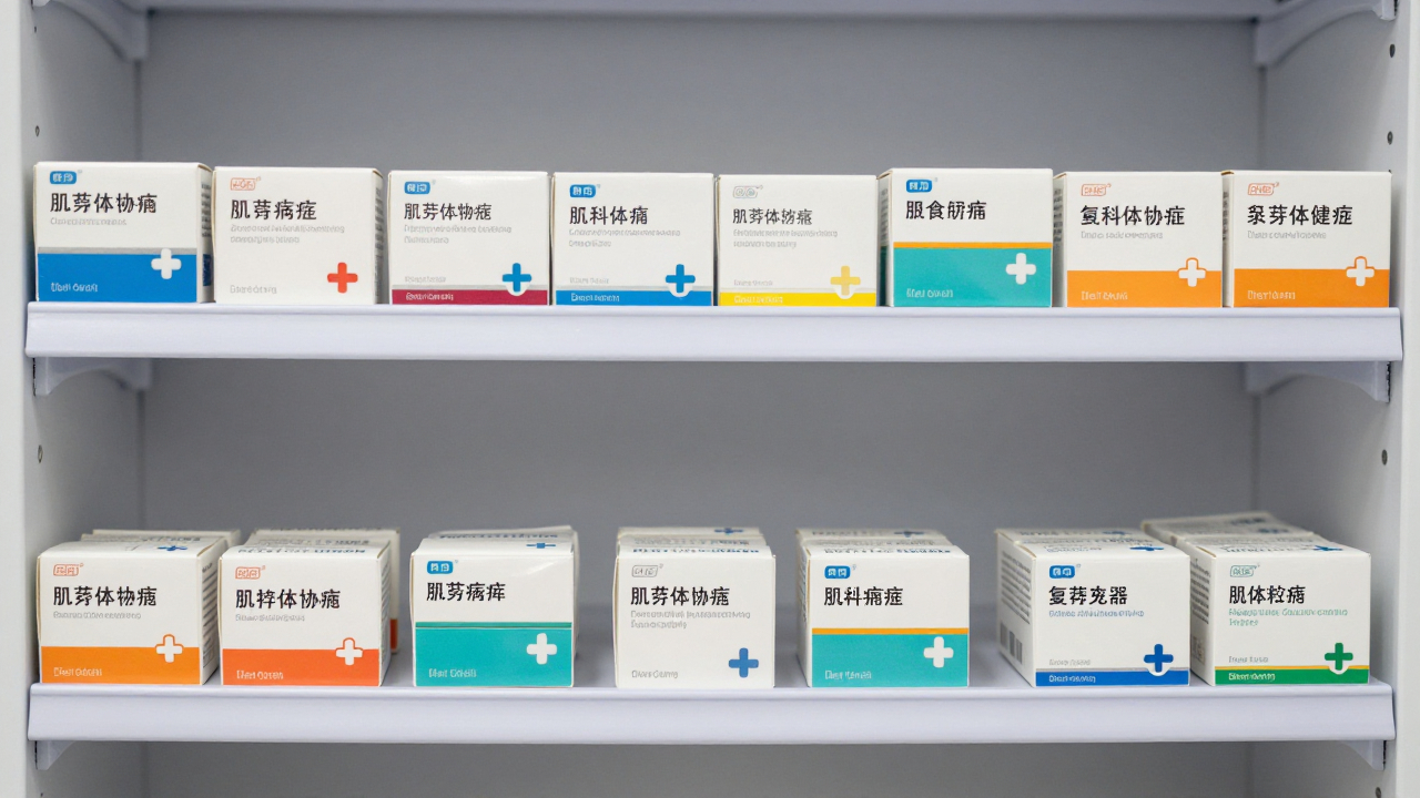 Полка с лекарствами и коробками, аккуратные ряды упаковок.