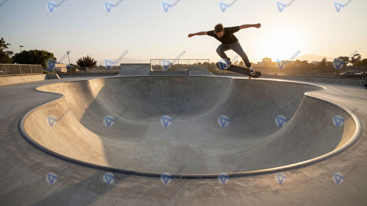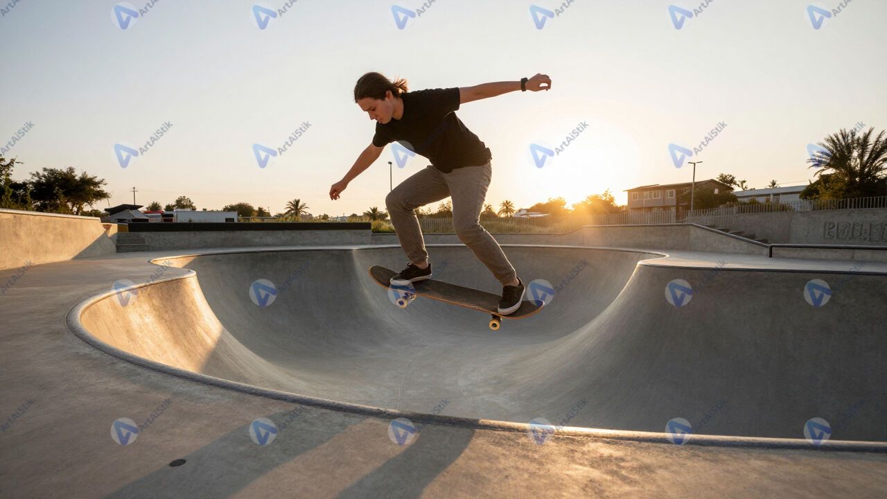 Скейтбордист катается в бетонной чаша‑рампе на закате.