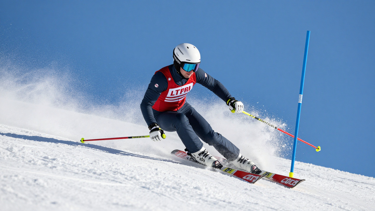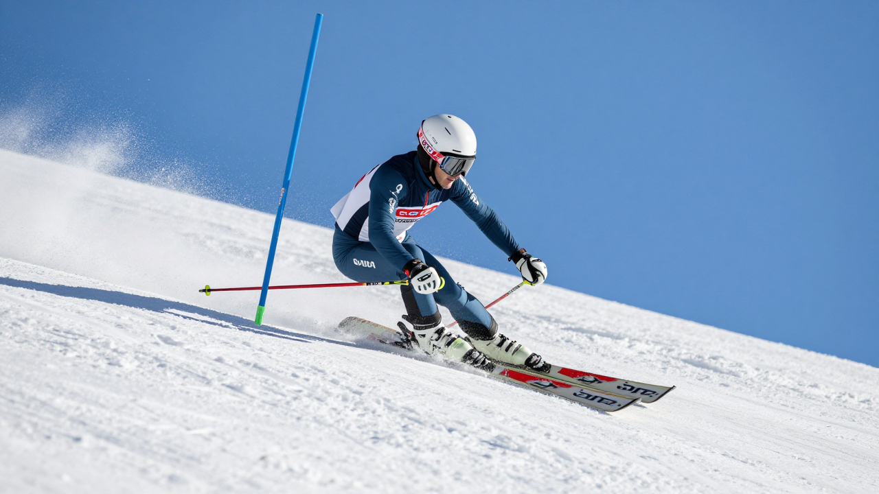 Лыжник на горнолыжном склоне, поворот между вешками.