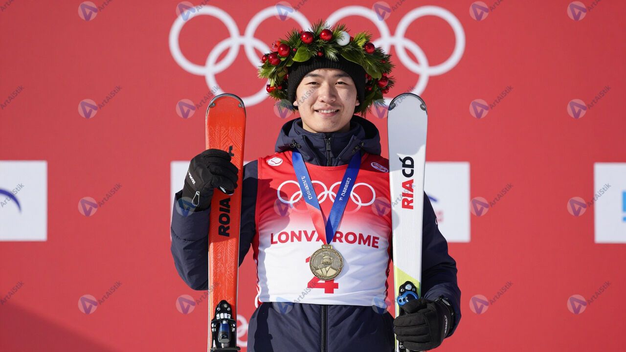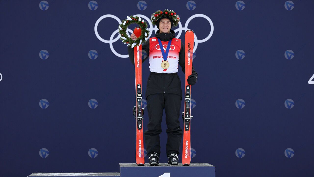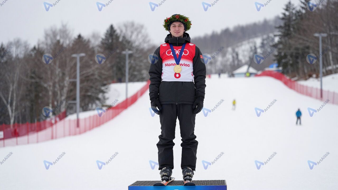 Лыжник на пьедестале с венком и медалью.