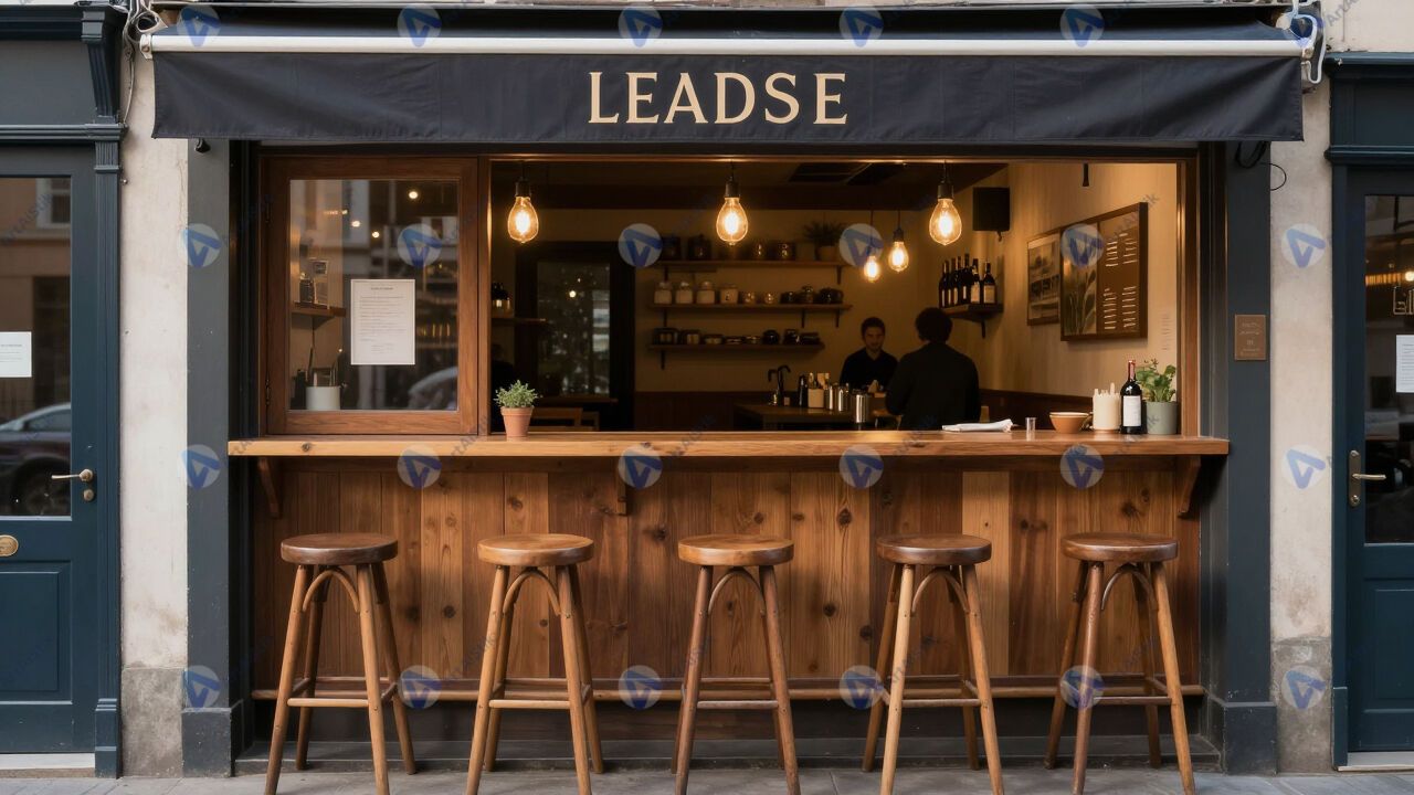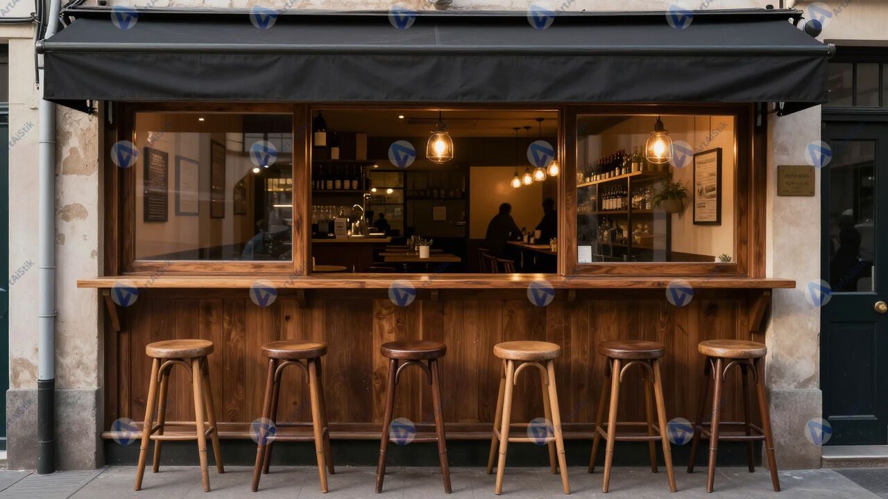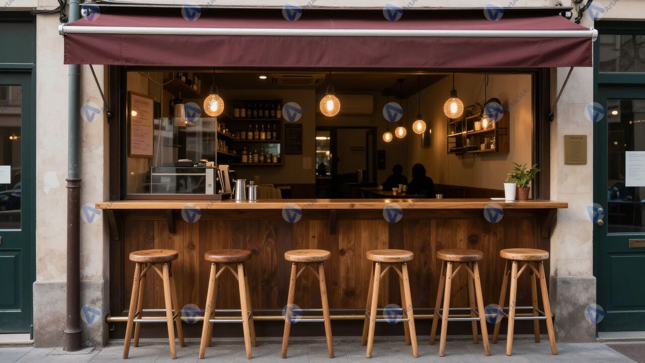 Маленькое бистро с высоким баром и табуретами.