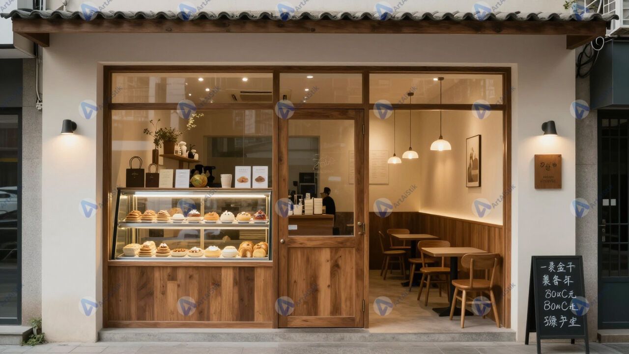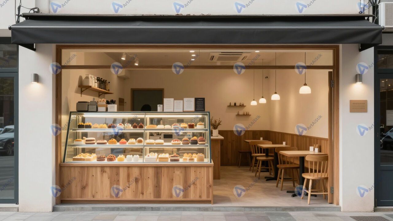 Небольшое кафе с открытой витриной и несколькими столами внутри.