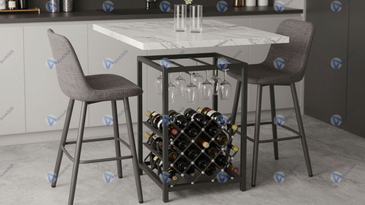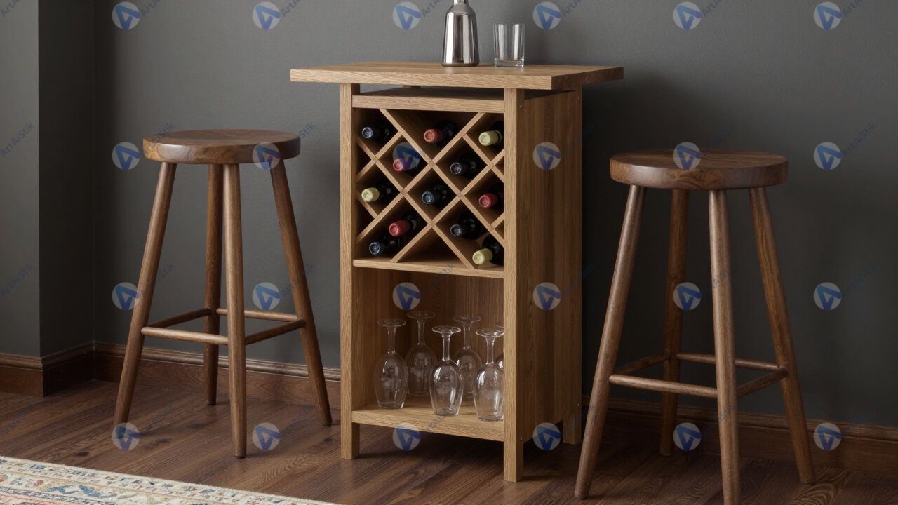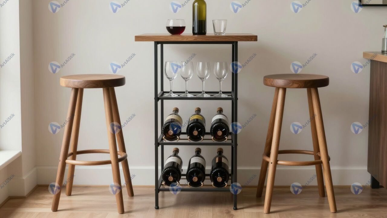Небольшая винная стойка с высокими табуретами и бокалами.
