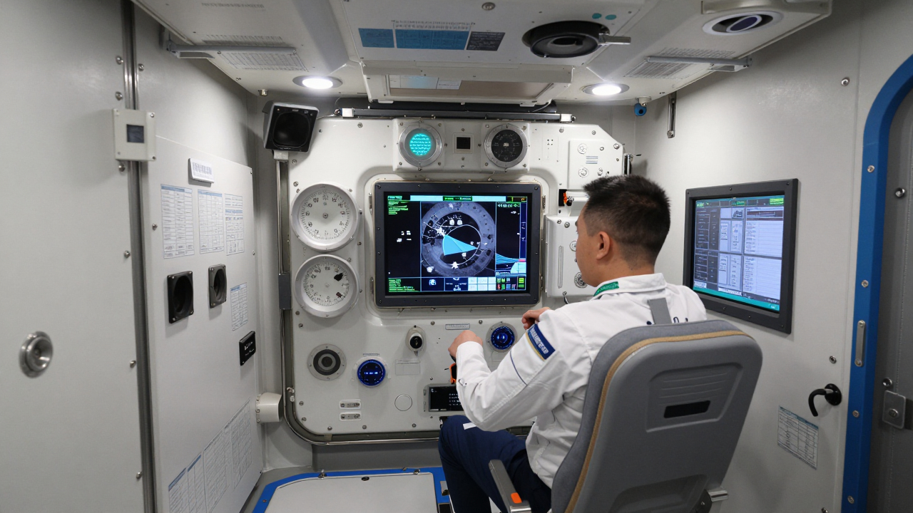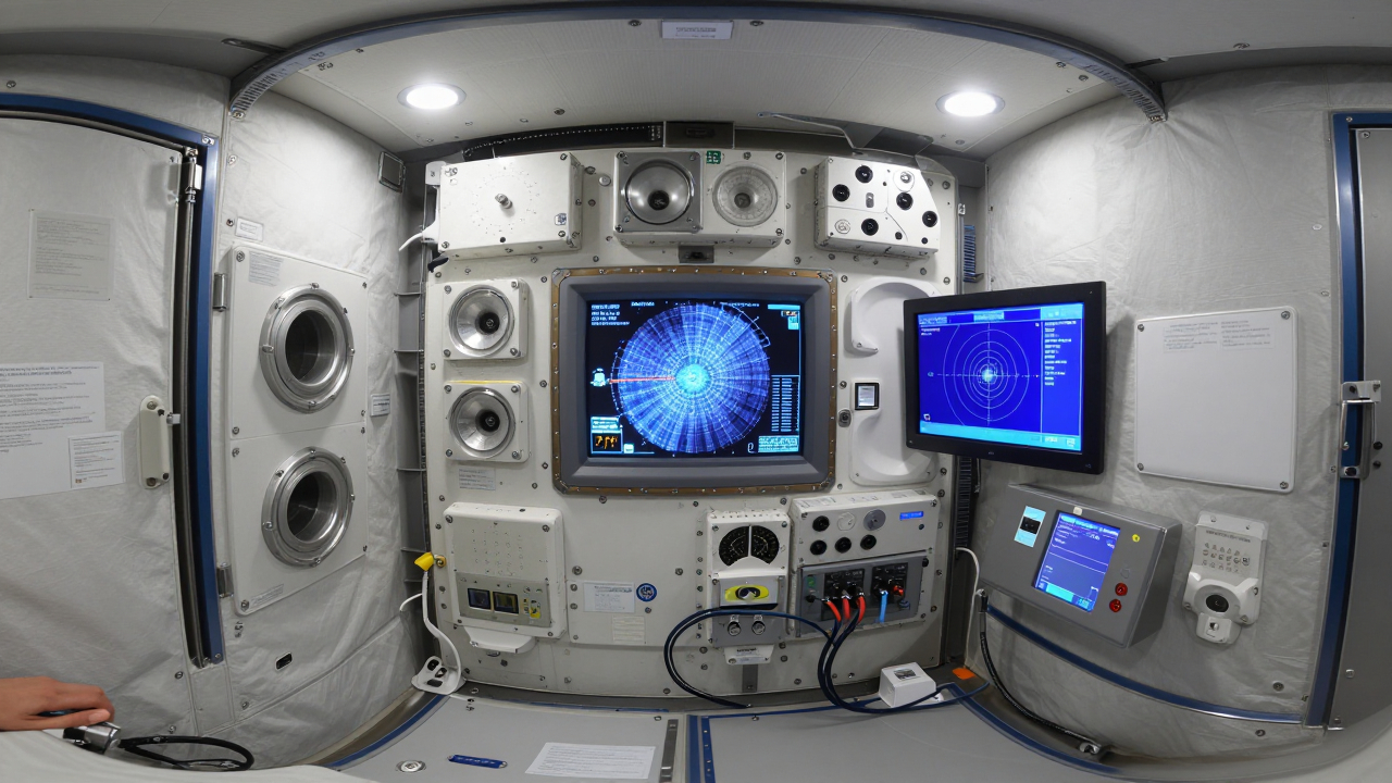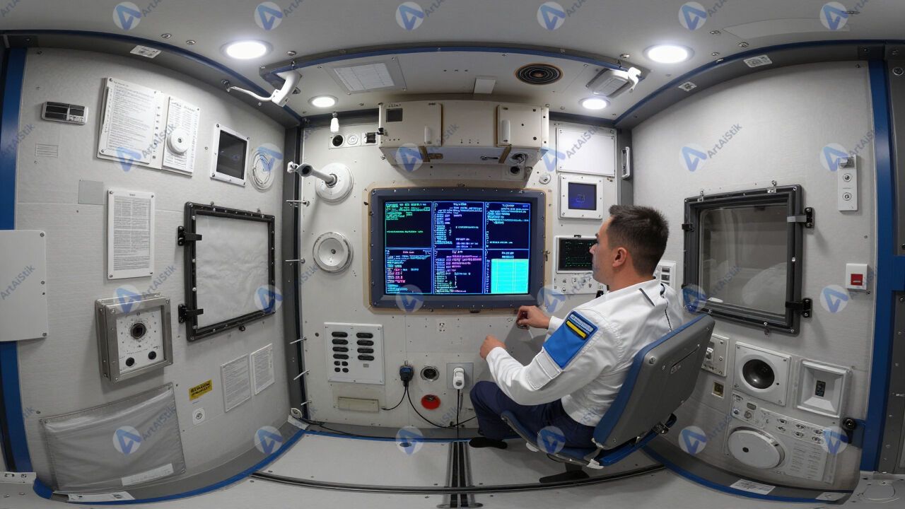 Кабина космического корабля, приборы и экраны вокруг кресел.