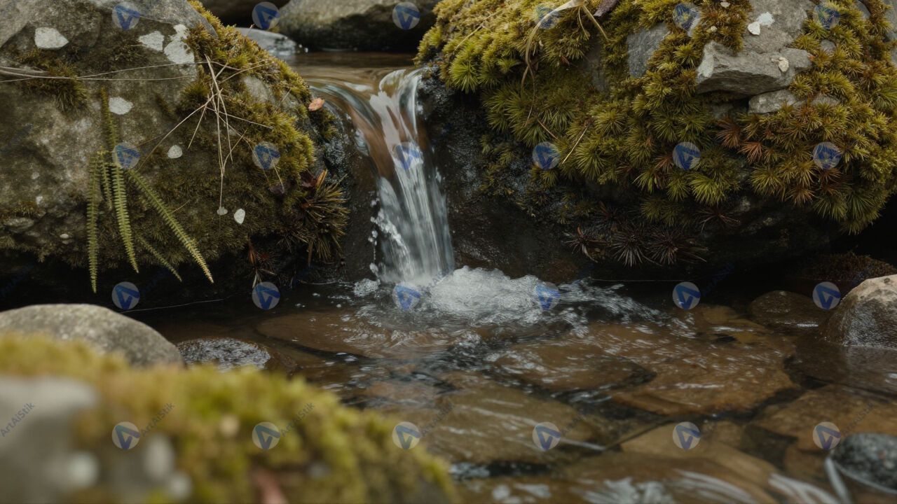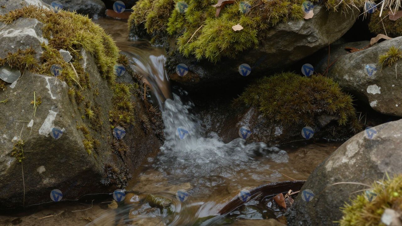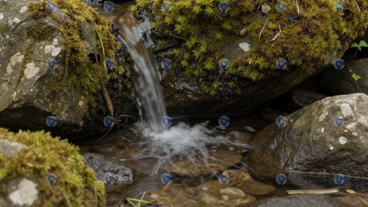 Родник из-под камней, чистая вода, мох вокруг.