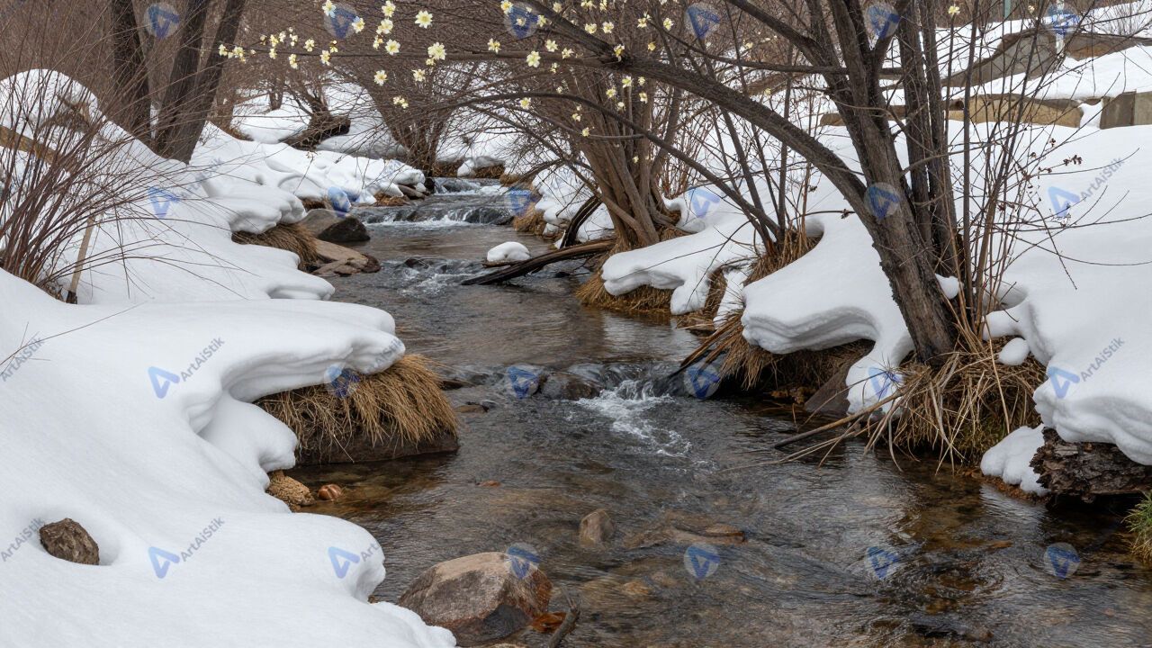 Весенний ручей, тающий снег, первые цветы у воды.