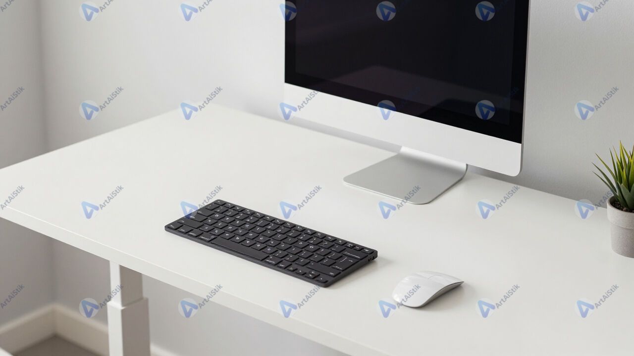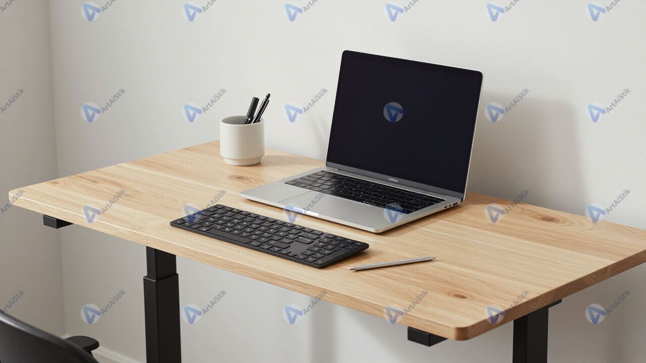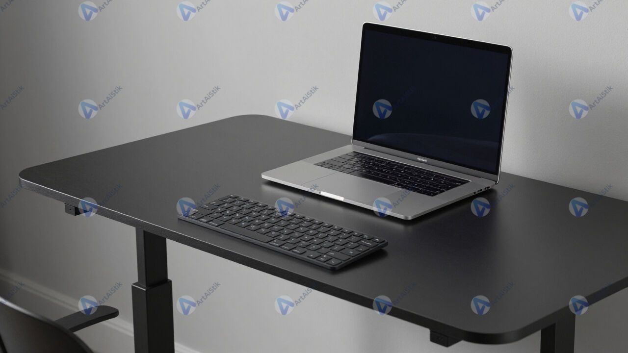 Стойка стоячего рабочего места с ноутбуком и внешней клавиатурой.