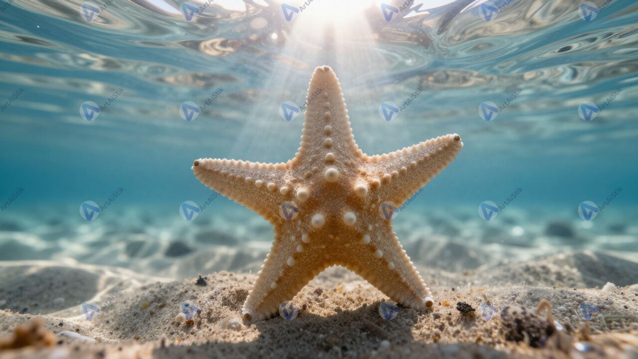 Морская звезда на дне, прозрачная вода, солнце сверху.