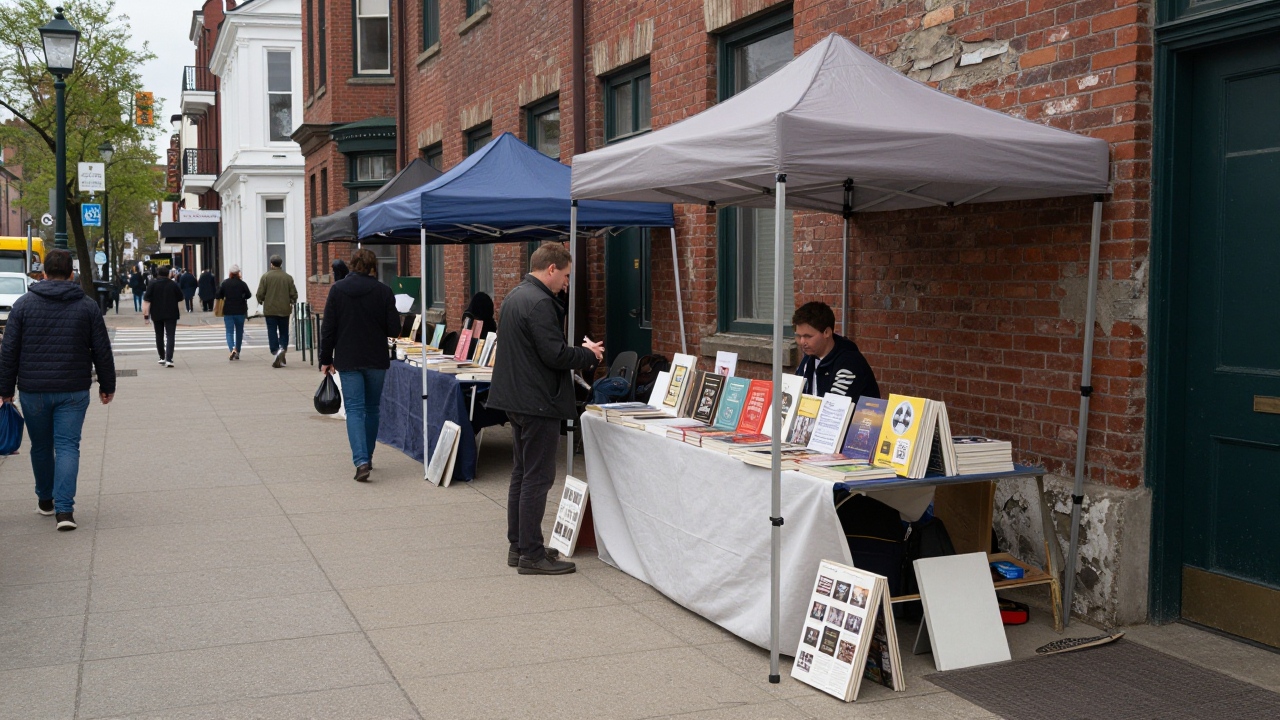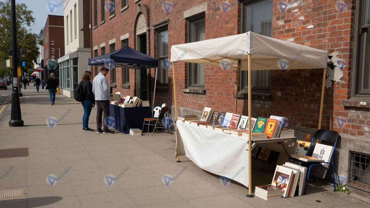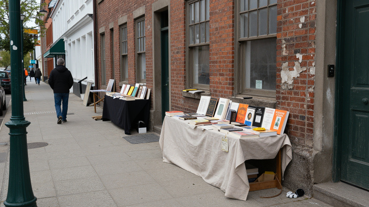 Уличная ярмарка книг, развалы вдоль тротуара.