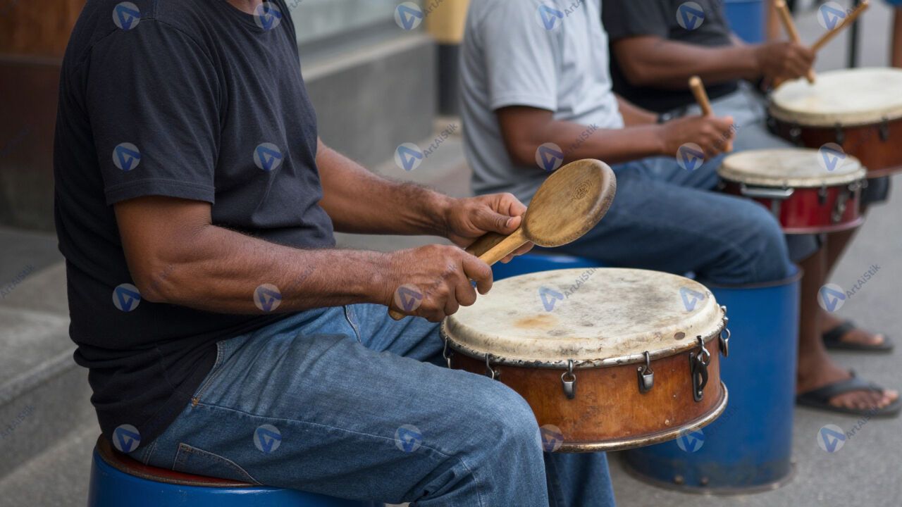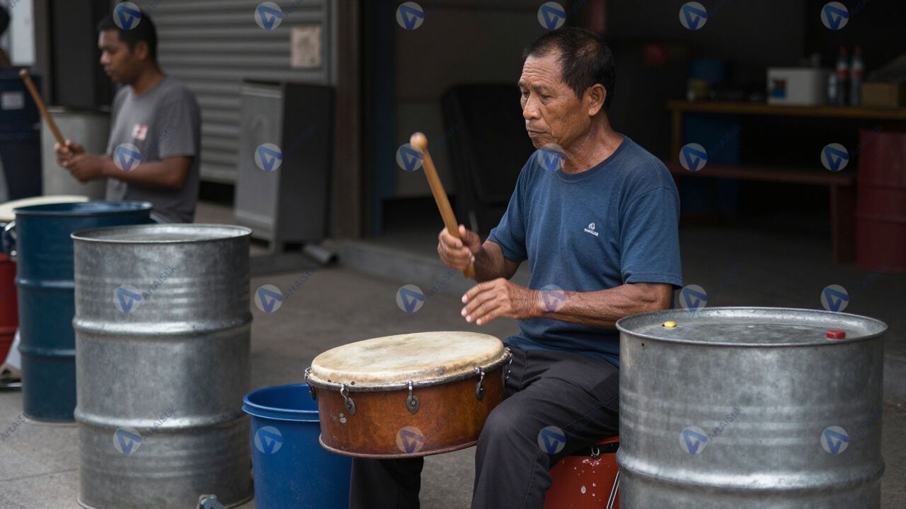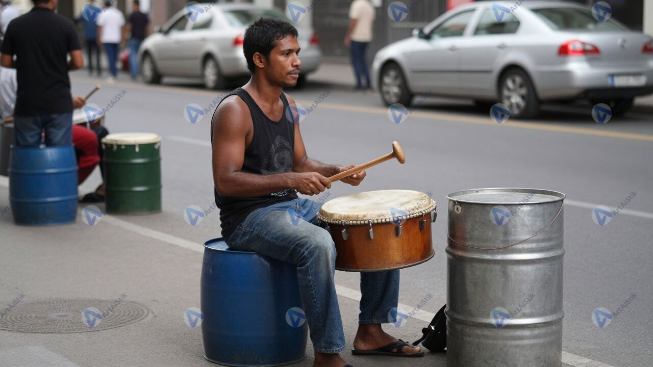 Уличный барабанщик играет на вёдрах и металлических баках.