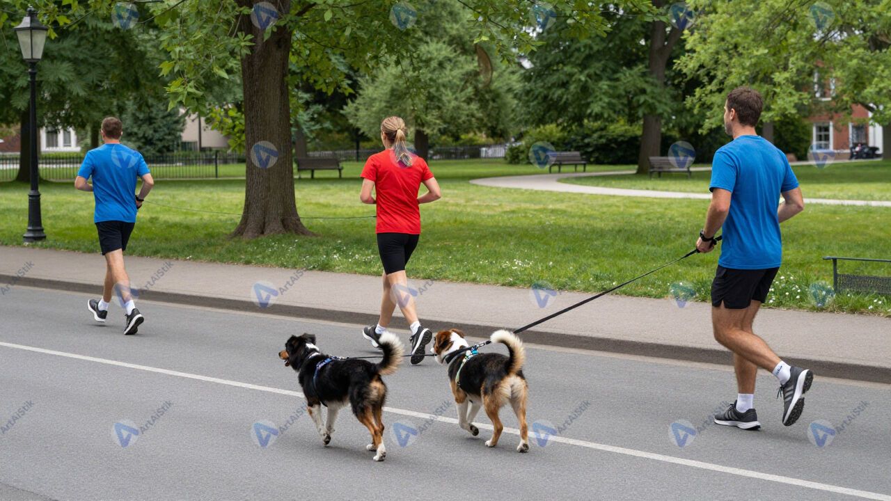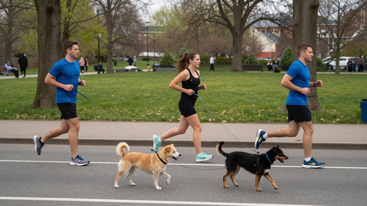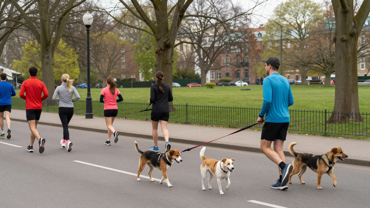 Улица возле парка, бегуны и собаки на поводках.