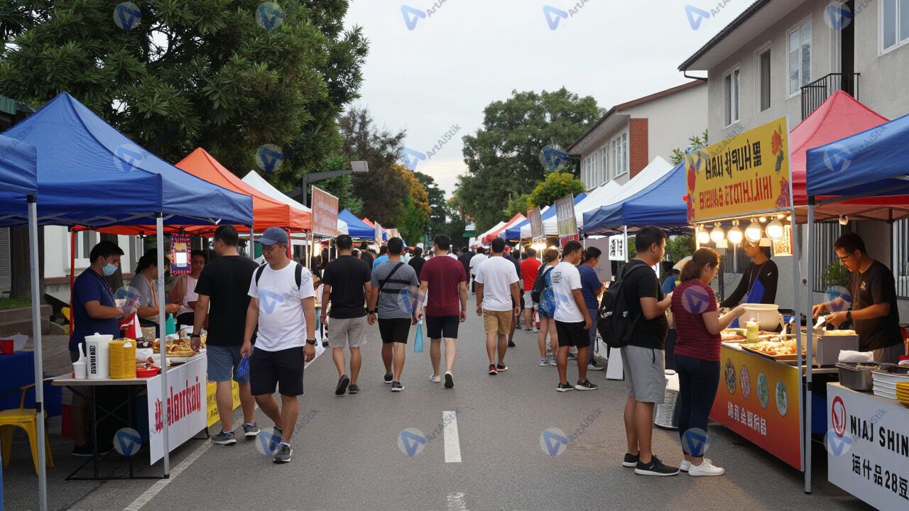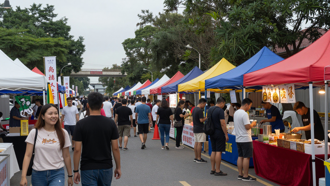 Улица с уличным фестивалем еды, палатки и толпа.