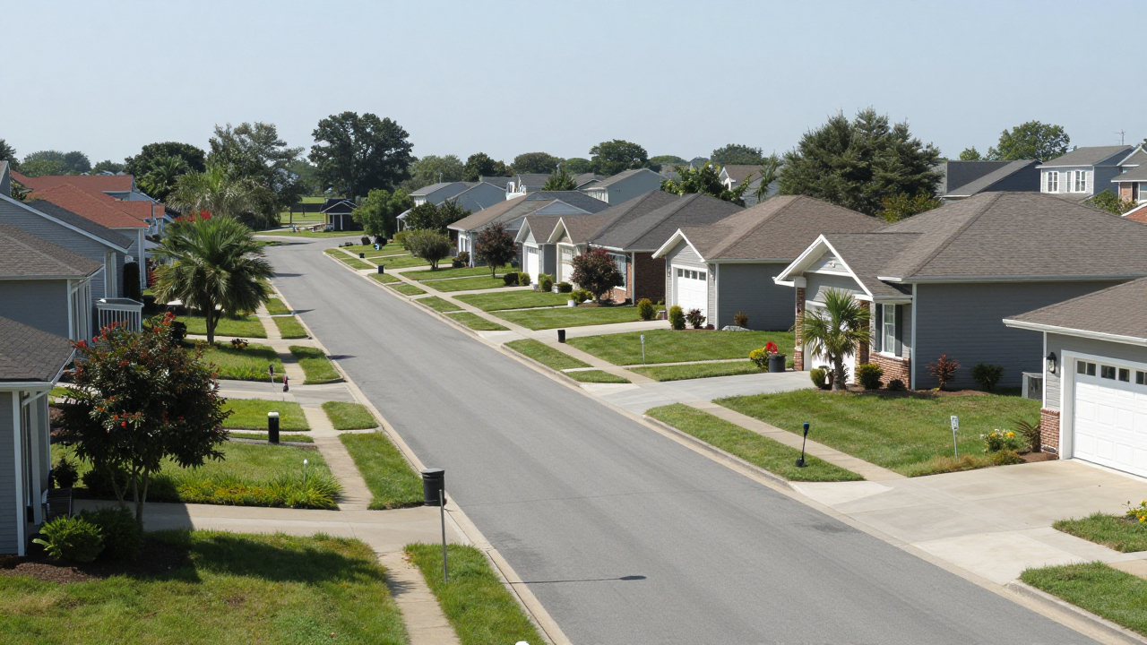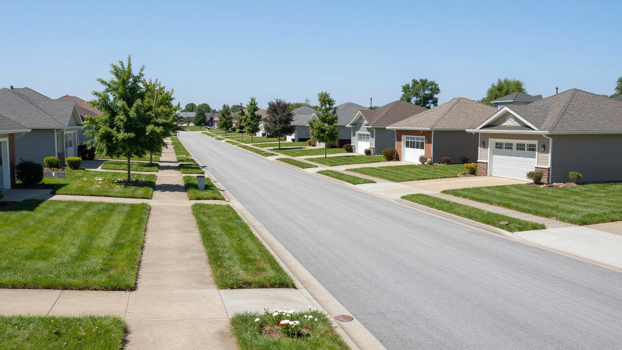 Улица в пригороде, аккуратные газоны и одинаковые дома.